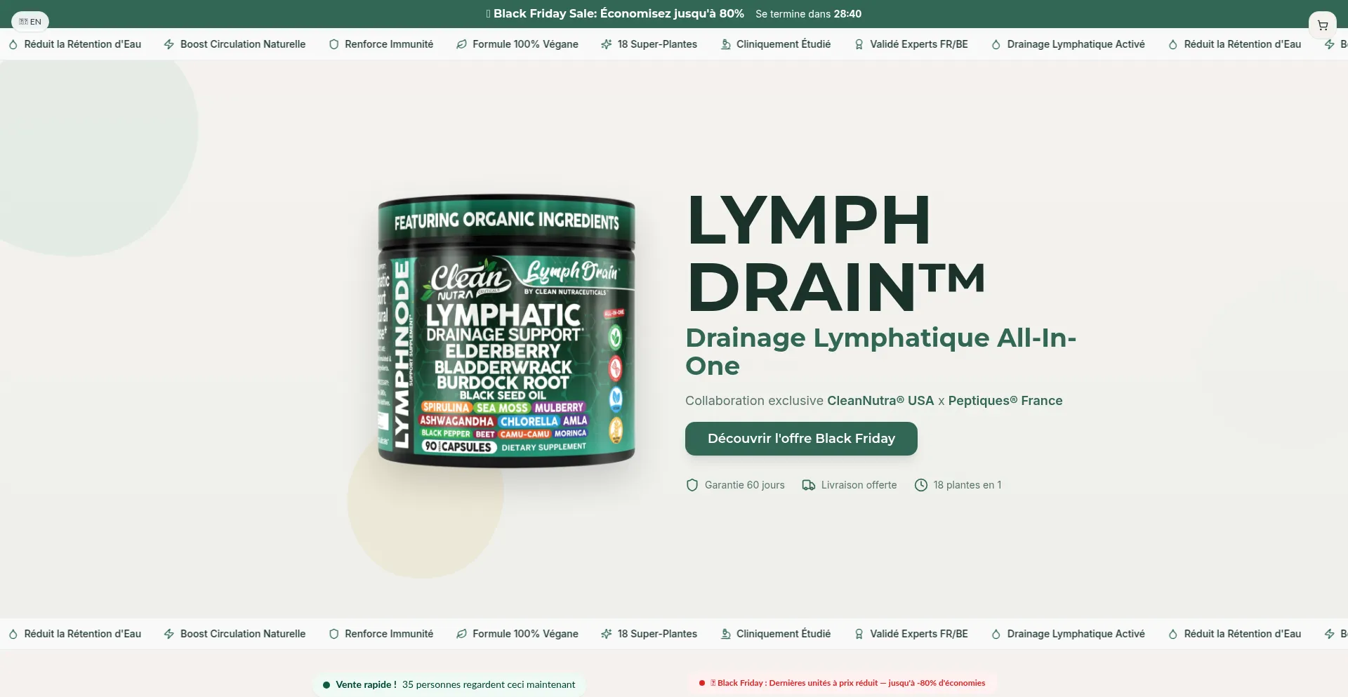 Collaboration exclusive CleanNutra® USA x Peptiques® France. 18 plantes en 1 formule pour drainage lymphatique, immunité et rétention d'eau. Offre Black Friday B1G1F.