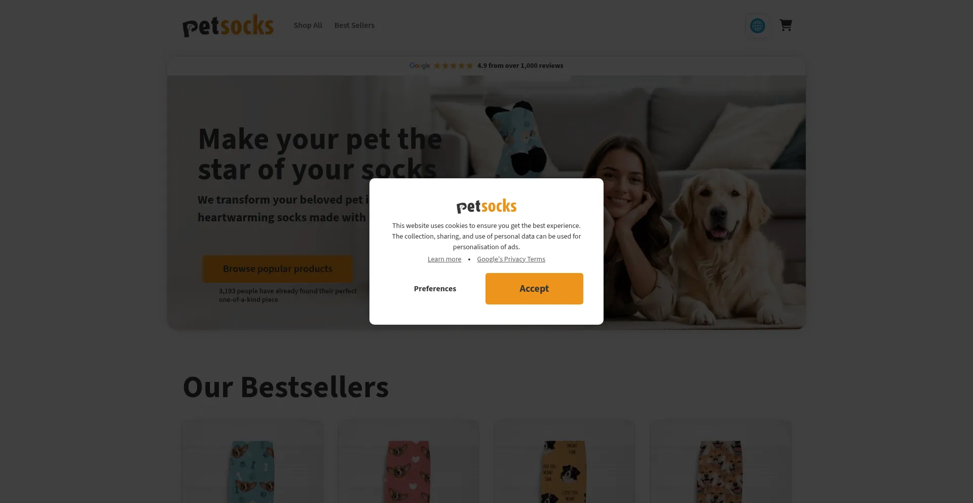El sitio web implementa mecanismos de consentimiento de cookies en cumplimiento con regulaciones de privacidad como GDPR o CCPA. Esto demuestra que pet-socks.com adhiere a estándares de protección de datos y proporciona a los usuarios control sobre prácticas de recolección de datos personales.