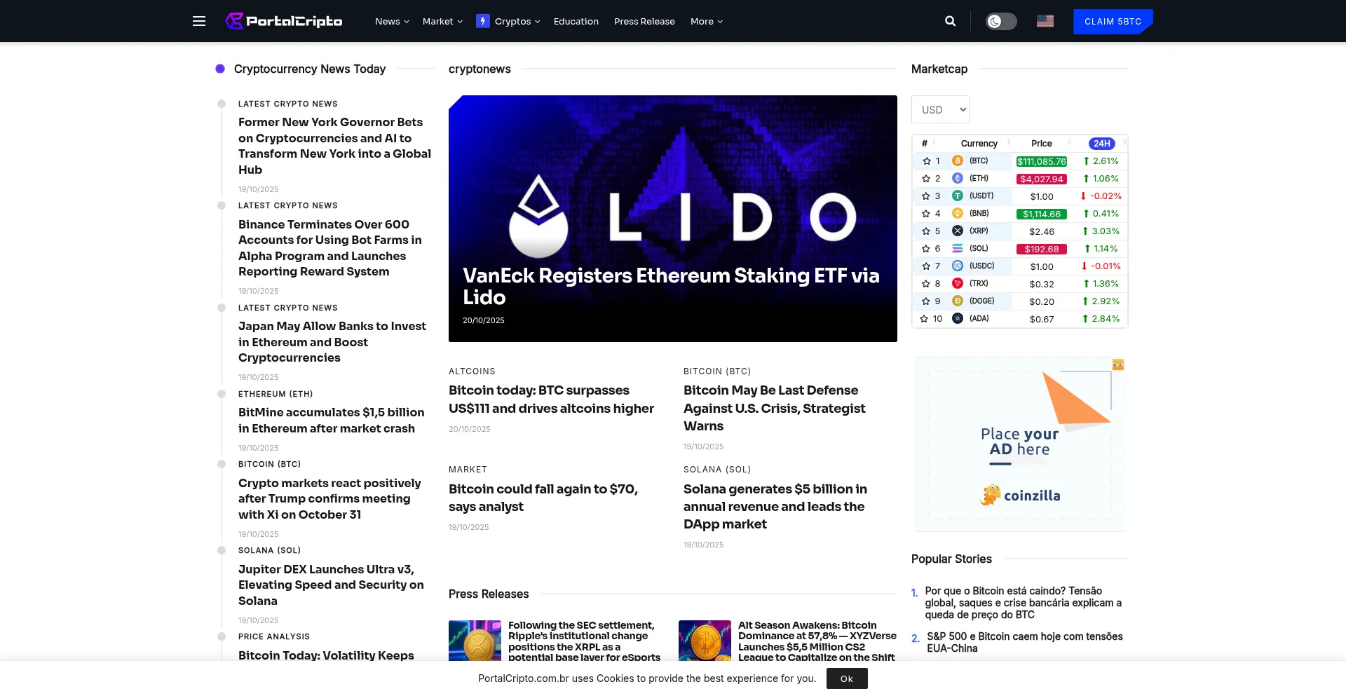 Discover the latest news and analysis on cryptocurrencies today at PortalCripto. Stay informed about the movements of Bitcoin, Ethereum and other important cryptos, as well as u...