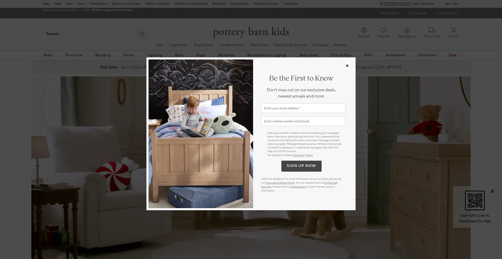 potterybarnkids.com tiene una aplicación móvil iOS disponible, indicando accesibilidad multiplataforma para usuarios de dispositivos Apple.
