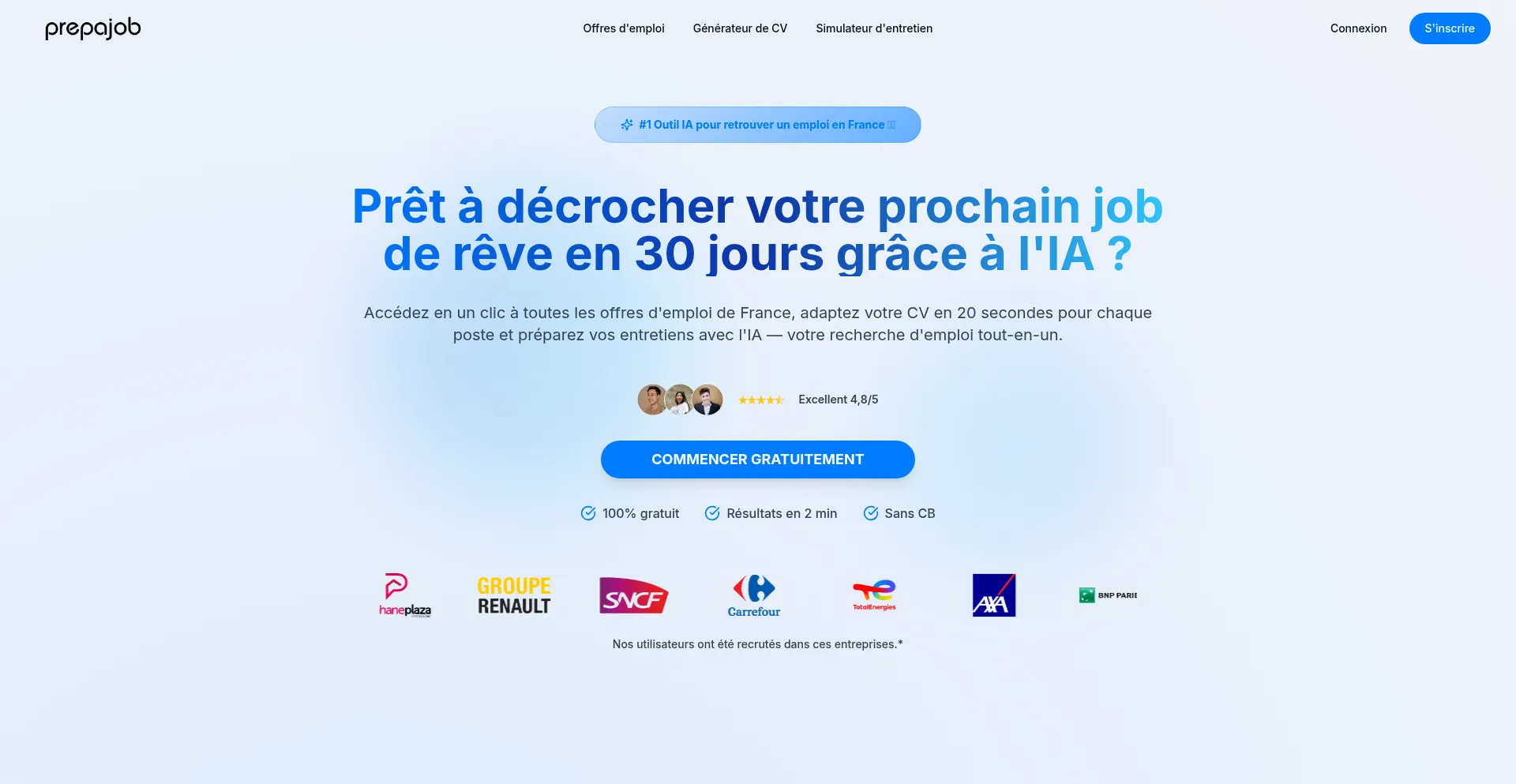 Prepajob : toutes les offres d'emploi France centralisées + CV optimisé IA + préparation entretien. 87% trouvent un emploi en 30 jours
