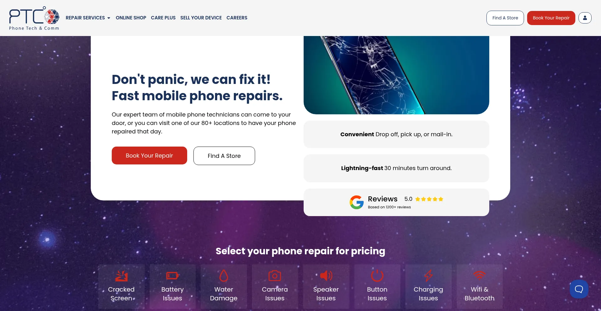 Get fast and reliable mobile phone repairs at PTC. With over 80 locations, we fix screens, batteries, and more. Book online for same-day service!