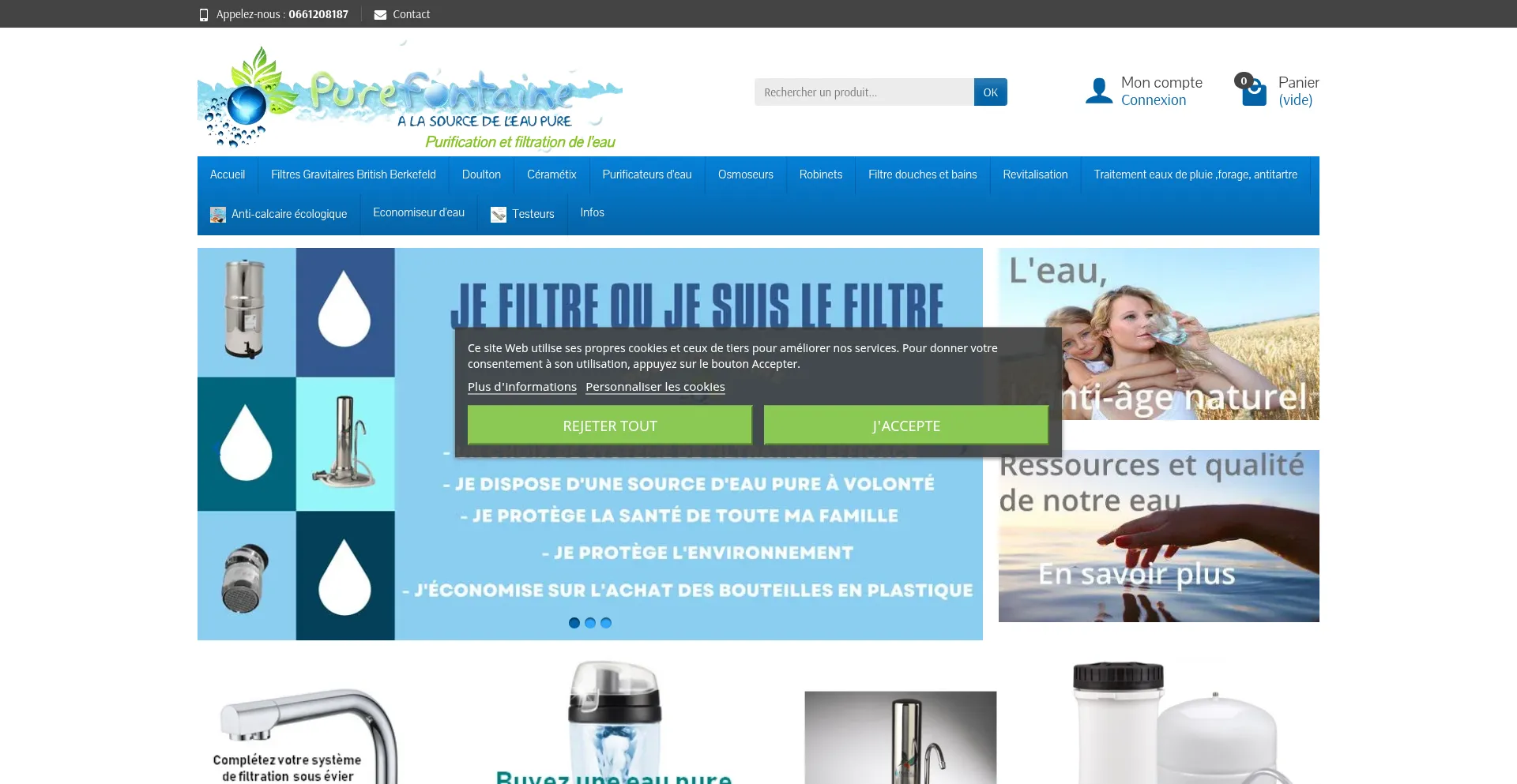 Purefontaine : Vente et conseil pour votre matériel de purification et de filtration de l'eau. Filtres céramique/charbon actif, osmoseurs, économiseurs d'eau, filtres pour do...