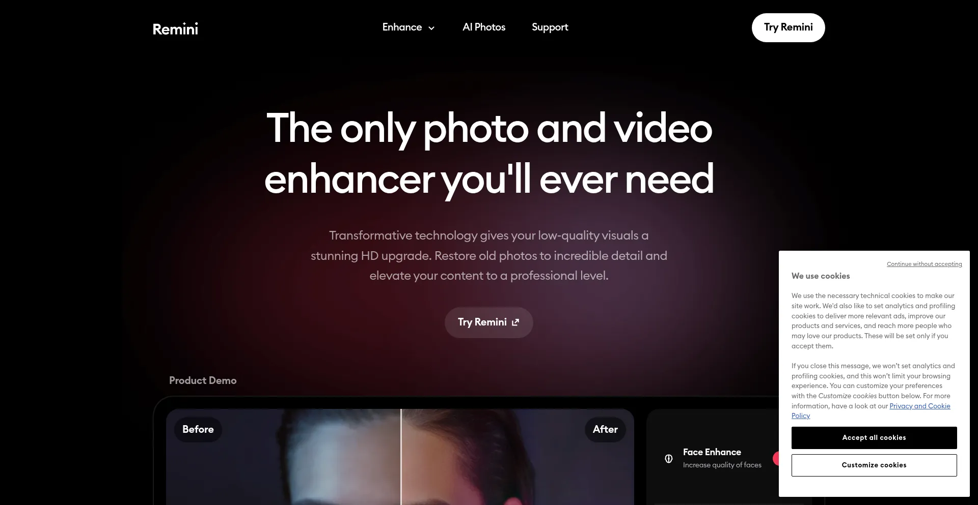 El sitio web implementa mecanismos de consentimiento de cookies en cumplimiento con regulaciones de privacidad como GDPR o CCPA. Esto demuestra que remini.ai adhiere a estándares de protección de datos y proporciona a los usuarios control sobre prácticas de recolección de datos personales.
