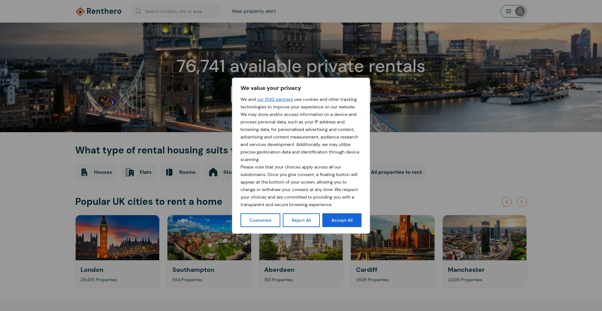 El sitio web implementa mecanismos de consentimiento de cookies en cumplimiento con regulaciones de privacidad como GDPR o CCPA. Esto demuestra que renthero.co.uk adhiere a estándares de protección de datos y proporciona a los usuarios control sobre prácticas de recolección de datos personales.