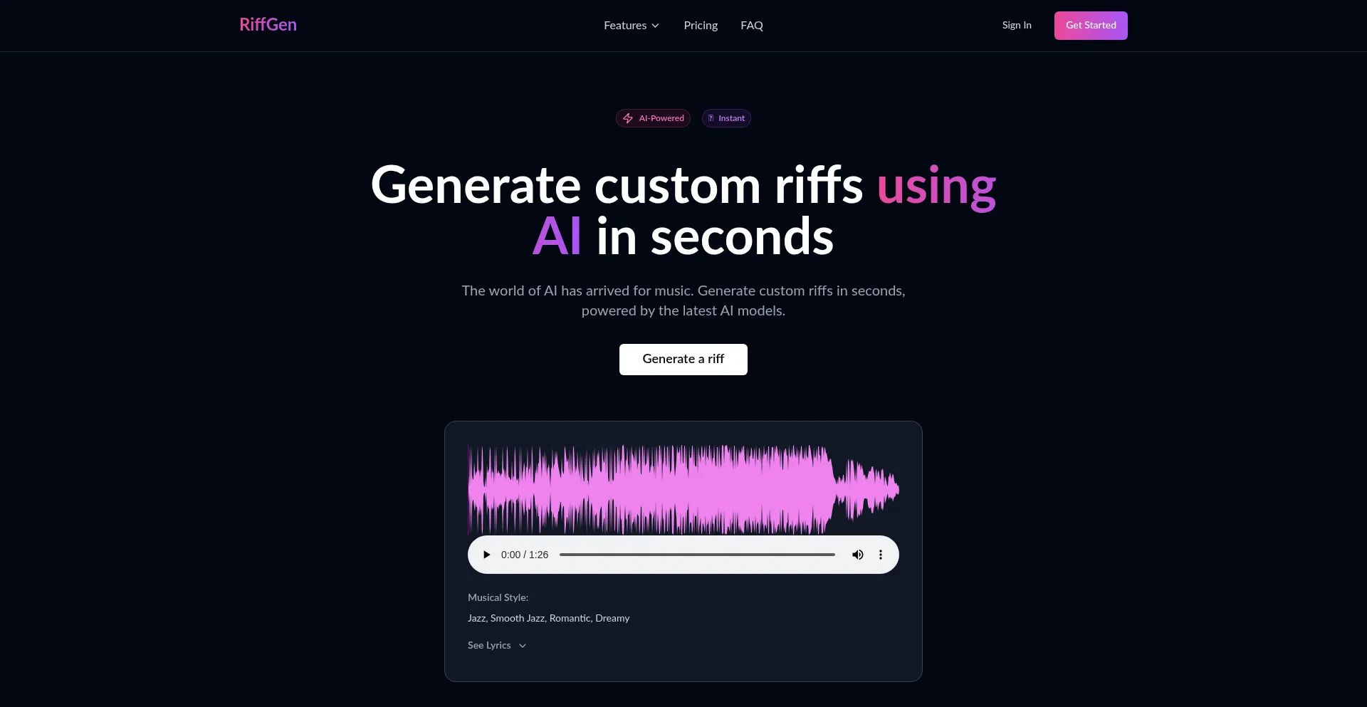 The world of AI has arrived for music. Generate custom riffs in seconds, powered by the latest AI models.