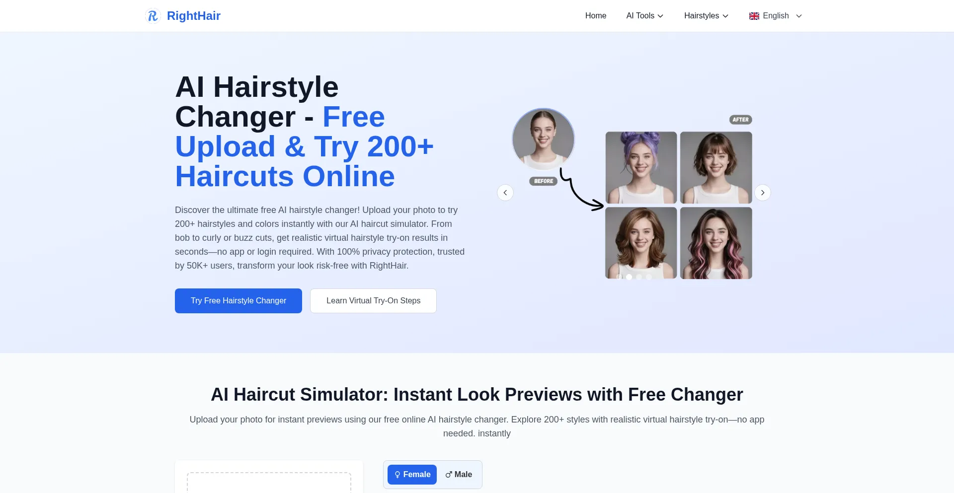 Try our free online AI hairstyle changer! Upload your photo for realistic AI hairstyle try-on of 200+ styles like bob or curly instantly. No app, no login.