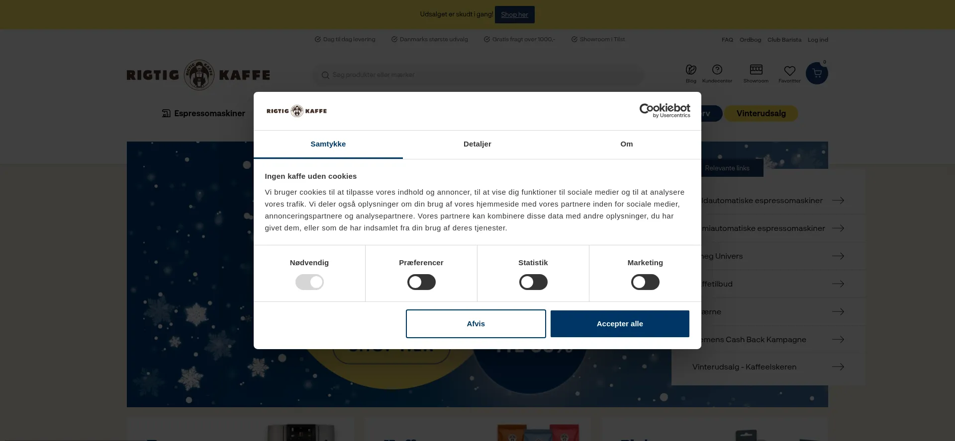 El sitio web implementa mecanismos de consentimiento de cookies en cumplimiento con regulaciones de privacidad como GDPR o CCPA. Esto demuestra que rigtigkaffe.dk adhiere a estándares de protección de datos y proporciona a los usuarios control sobre prácticas de recolección de datos personales.