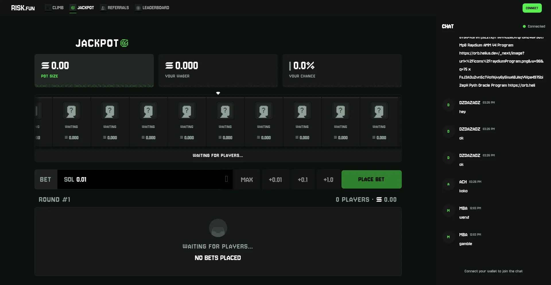 Risk.fun is a Solana-native, degen-first playground: on-chain games, points (RP), memecoins, and rewards. Take the risk. Get the reward.