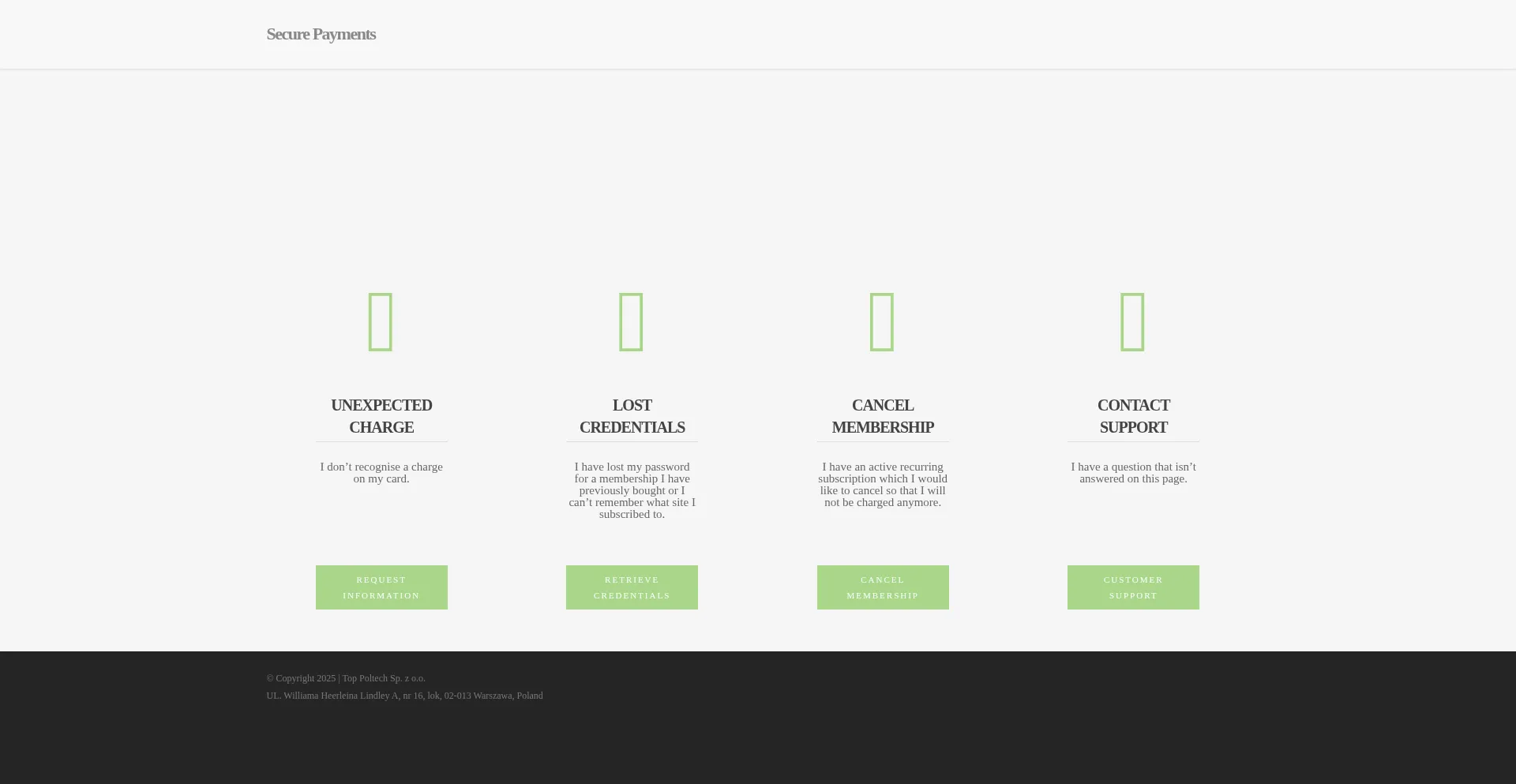 El sitio web contiene secciones dedicadas que abordan disputas de pago, gestión de suscripciones, procedimientos de contracargo, políticas de reembolso y otras preocupaciones de transacciones financieras, indicando operaciones de facturación establecidas.