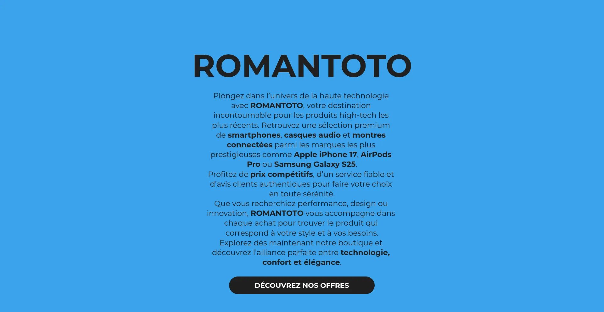 ROMANTOTO : votre boutique high-tech de confiance ! iPhone 17, Galaxy S25, AirPods Pro et bien plus, à petits prix avec service client premium.