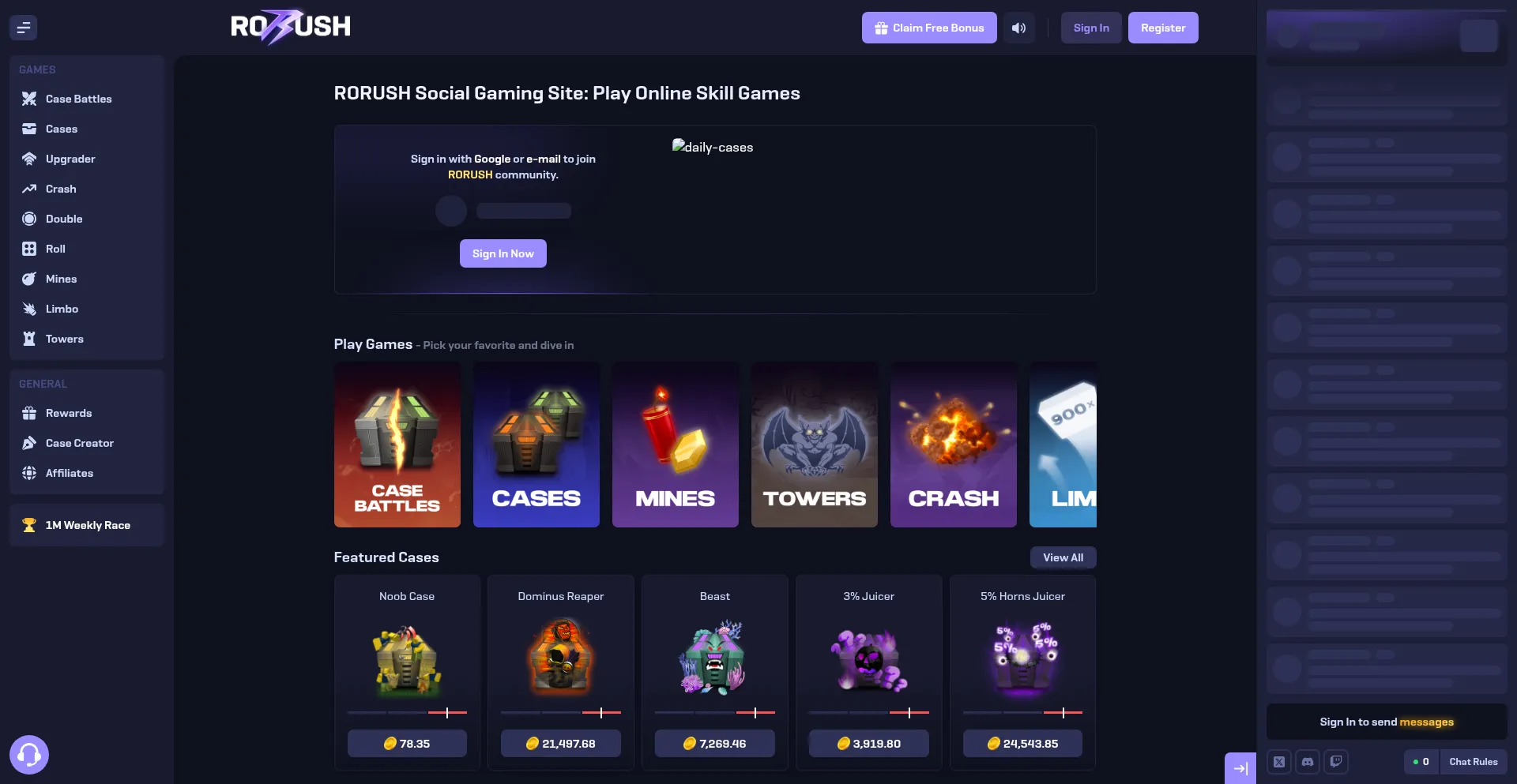 Play original skill games like Case Battles, Crash, and Towers at RORUSH. Win exclusive prizes and join weekly races for free on the best social gaming site.