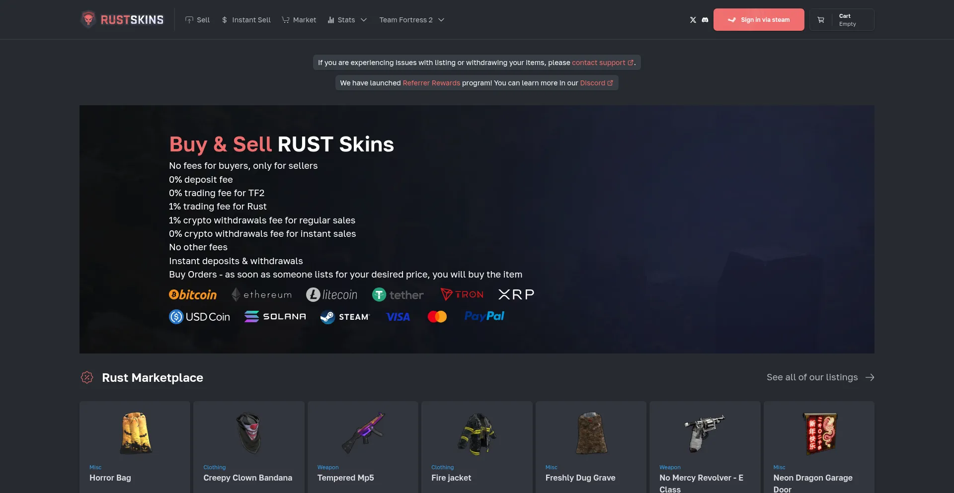Buy Rust Skins with the lowest fees in the market, only a 1% trading fee and a 1% fee for withdrawals in crypto. Instant deposits and withdrawals.