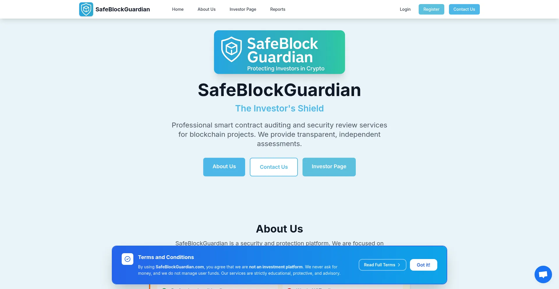 SafeBlockGuardian - The Investor's Shield. Independent blockchain project audits, smart contract security reviews, and liquidity verification. Protect yourself from crypto scams...
