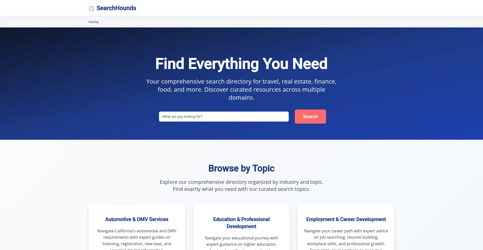 SearchHounds is your comprehensive search directory for travel, real estate, finance, food, insurance and more. Find curated resources across multiple domains.