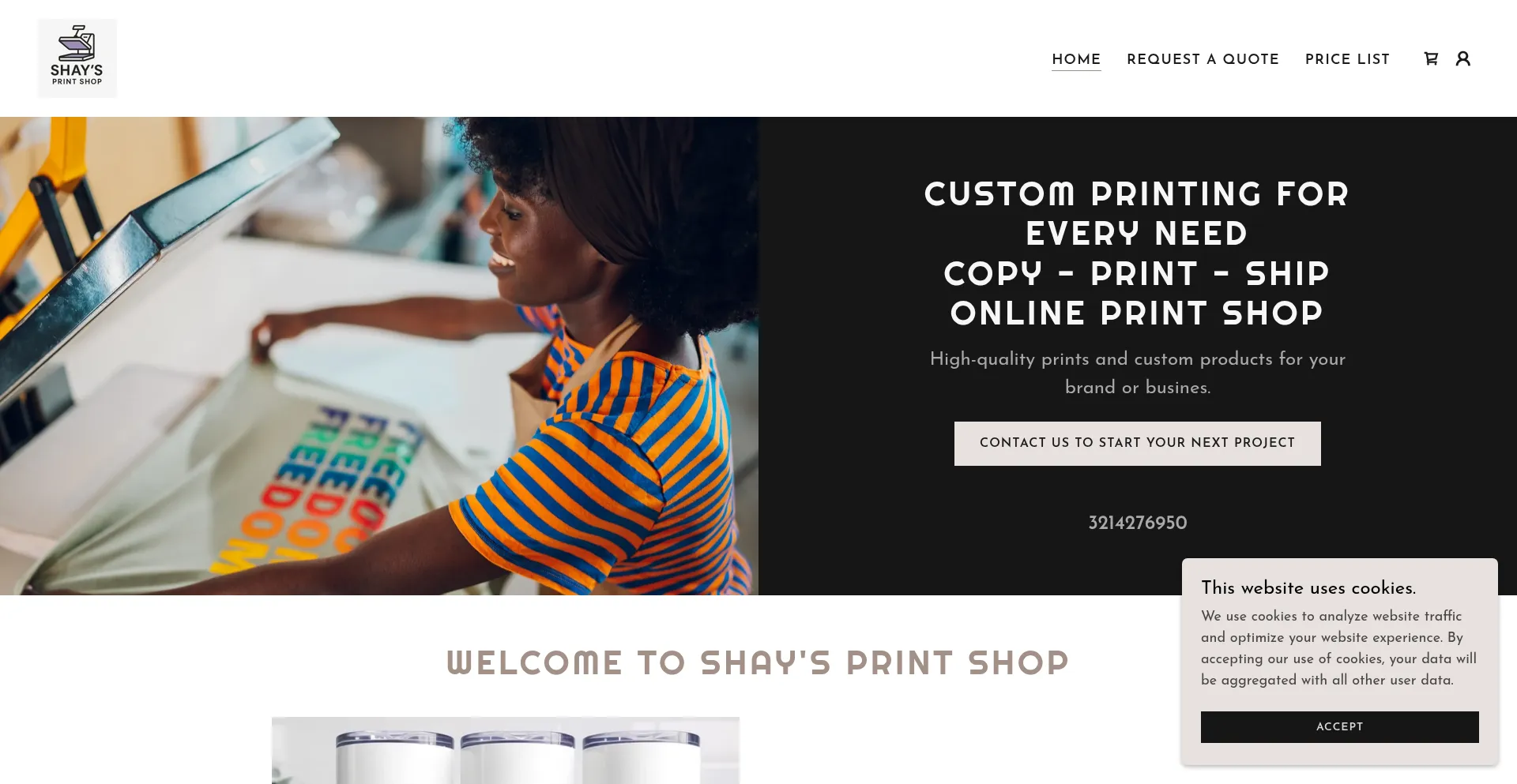 El sitio web implementa mecanismos de consentimiento de cookies en cumplimiento con regulaciones de privacidad como GDPR o CCPA. Esto demuestra que shaysprintshop.com adhiere a estándares de protección de datos y proporciona a los usuarios control sobre prácticas de recolección de datos personales.