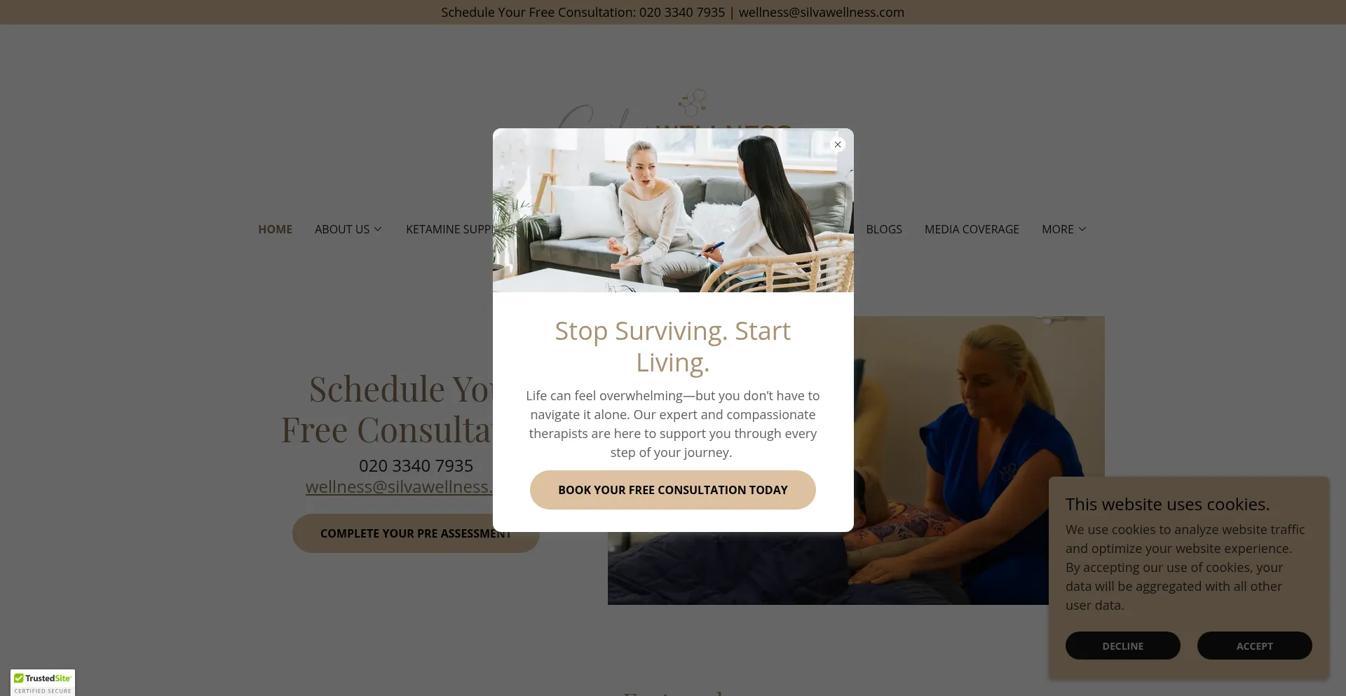 El sitio web implementa mecanismos de consentimiento de cookies en cumplimiento con regulaciones de privacidad como GDPR o CCPA. Esto demuestra que silvawellness.com adhiere a estándares de protección de datos y proporciona a los usuarios control sobre prácticas de recolección de datos personales.