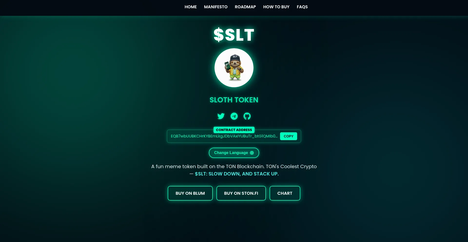A fun meme token built on the TON Blockchain. TON's Coolest Crypto — $SLT: SLOW DOWN, AND STACK UP.