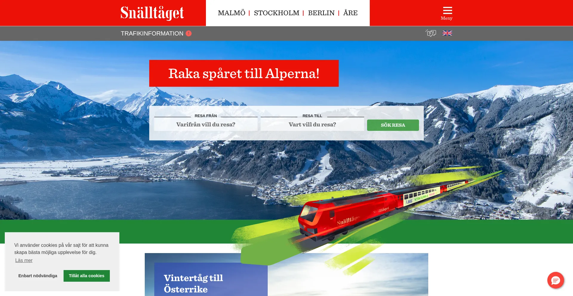 Boka din tågresa med Snälltåget till Berlin, Malmö, Stockholm, Vemdalen, Åre, Österrike. Res bekvämt med våra dagtåg och nattåg och njut av något gott i vår restaura...