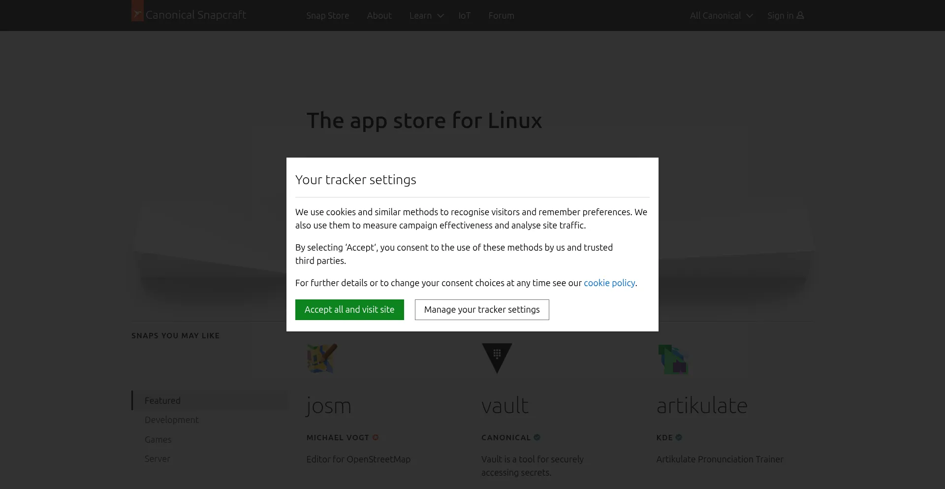 El sitio web implementa mecanismos de consentimiento de cookies en cumplimiento con regulaciones de privacidad como GDPR o CCPA. Esto demuestra que snapcraft.io adhiere a estándares de protección de datos y proporciona a los usuarios control sobre prácticas de recolección de datos personales.