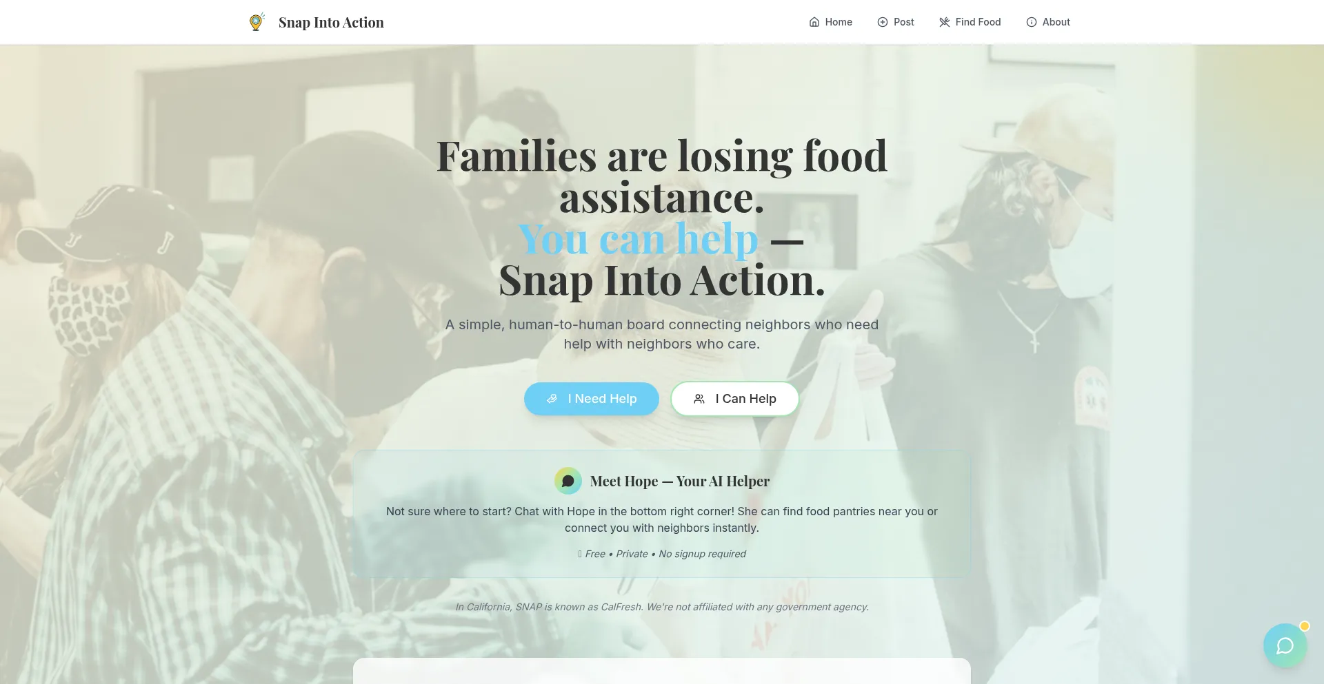 A free community board connecting people who need food assistance with neighbors who want to help. No red tape, just kindness.