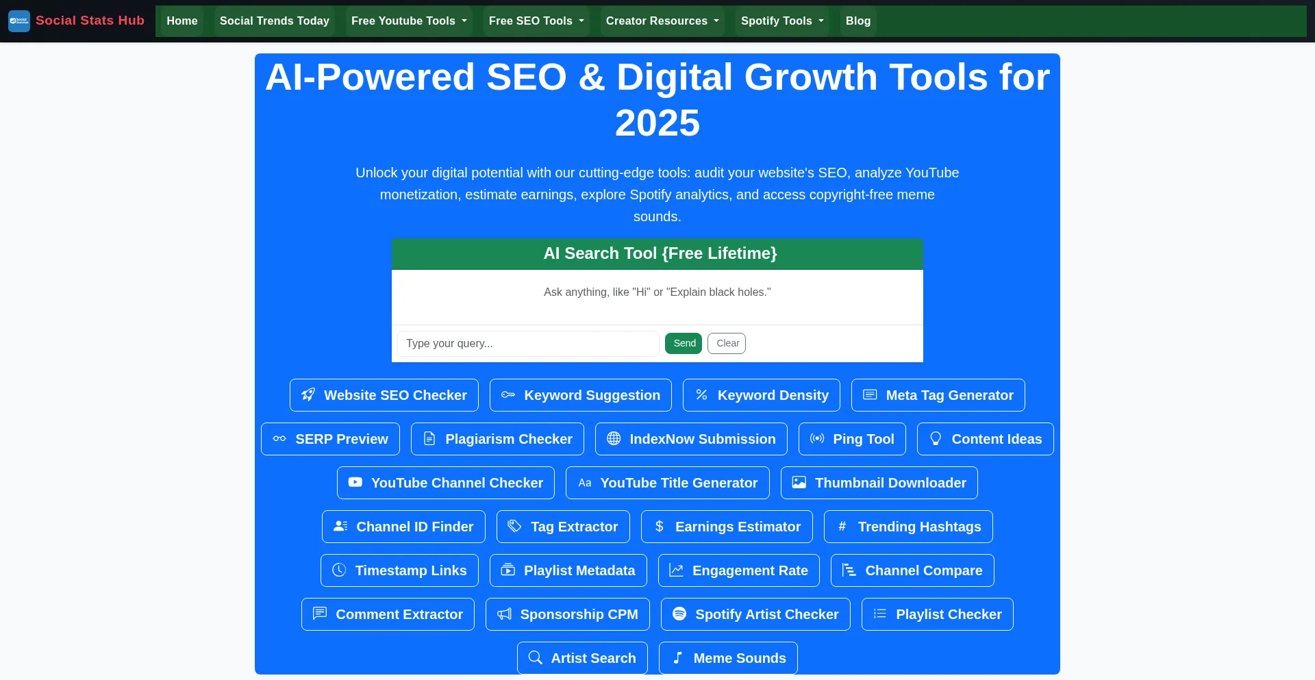 Boost your digital presence with our 2025 AI-powered tools: free website SEO audit, YouTube monetization checker, earnings estimator, Spotify analytics, and copyright-free meme ...