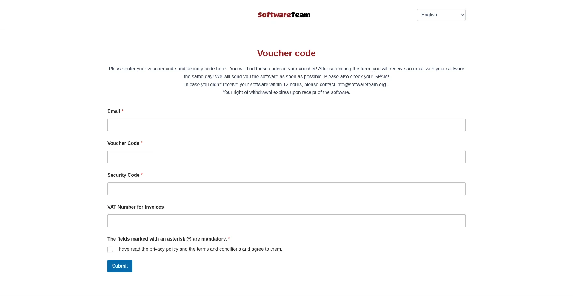 Voucher code Please enter your voucher code and security code here. You will find these codes in your voucher! After submitting the form, you will receive an email with your sof...