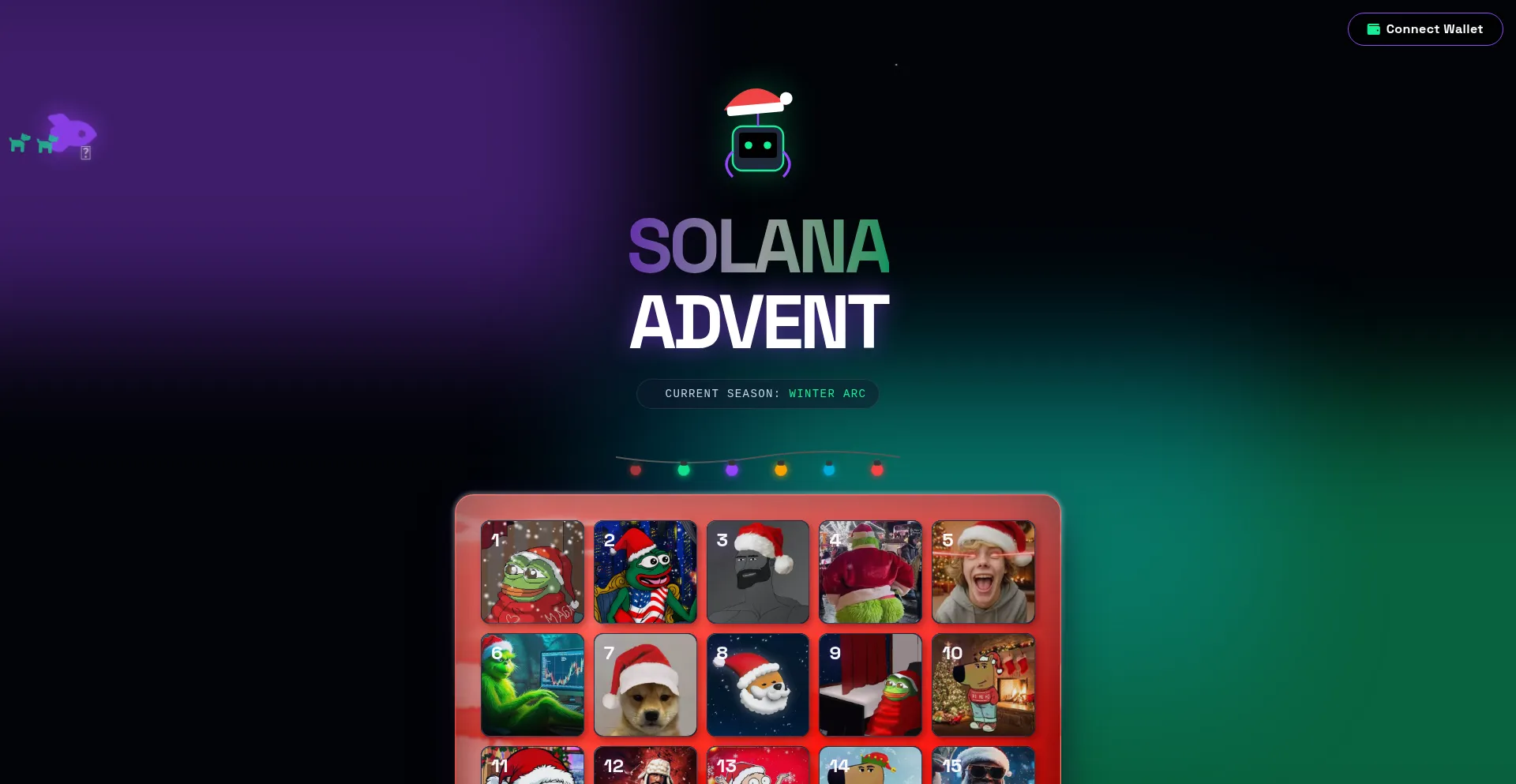 Holiday advent calendar powered by Solana prizes and tickets.
