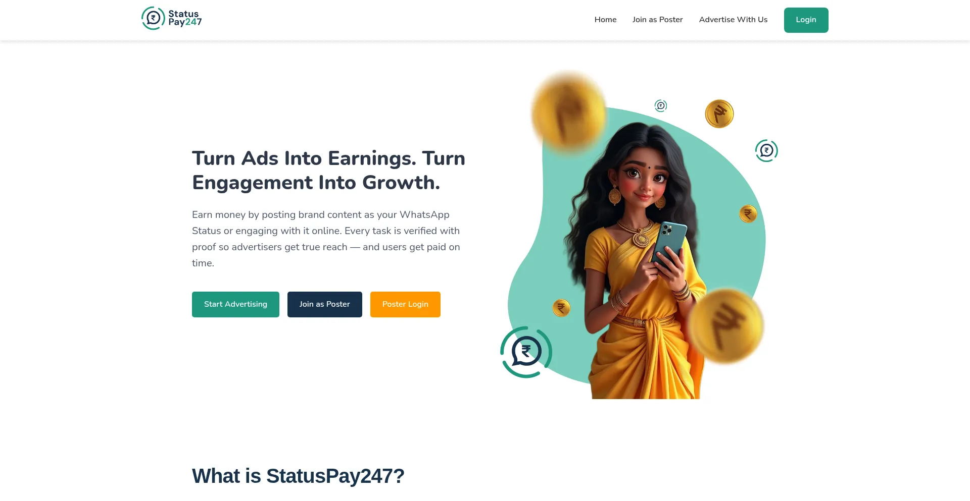 StatusPay247 - Earn money by posting ads on your WhatsApp status. Join India's trusted WhatsApp status advertising platform.