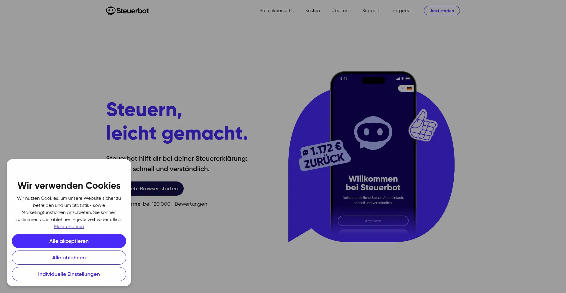 Steuerbot hilft dir bei deiner Steuererklärung: einfach, schnell und verständlich. Sichere dir im Schnitt 1.172 € Rückerstattung.