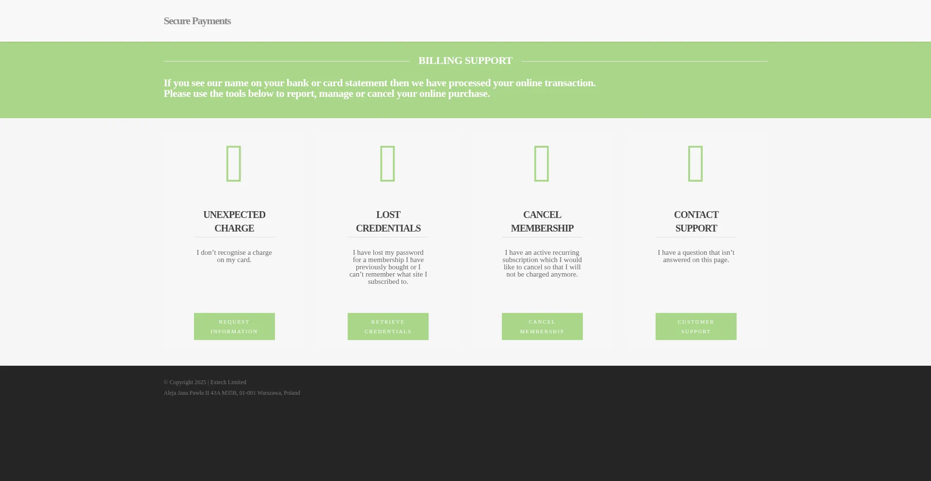 El sitio web contiene secciones dedicadas que abordan disputas de pago, gestión de suscripciones, procedimientos de contracargo, políticas de reembolso y otras preocupaciones de transacciones financieras, indicando operaciones de facturación establecidas.