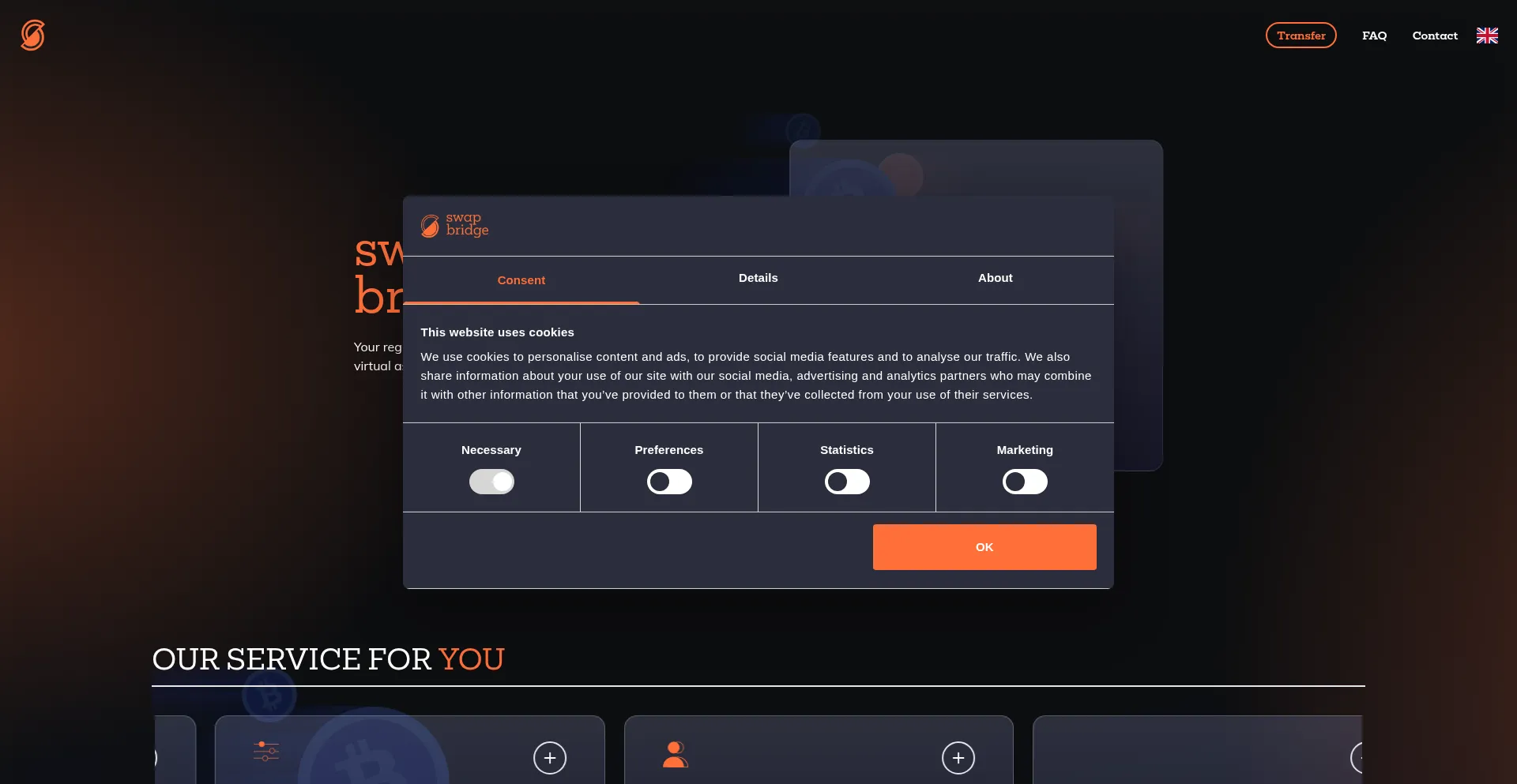 El sitio web implementa mecanismos de consentimiento de cookies en cumplimiento con regulaciones de privacidad como GDPR o CCPA. Esto demuestra que swap-bridge.com adhiere a estándares de protección de datos y proporciona a los usuarios control sobre prácticas de recolección de datos personales.
