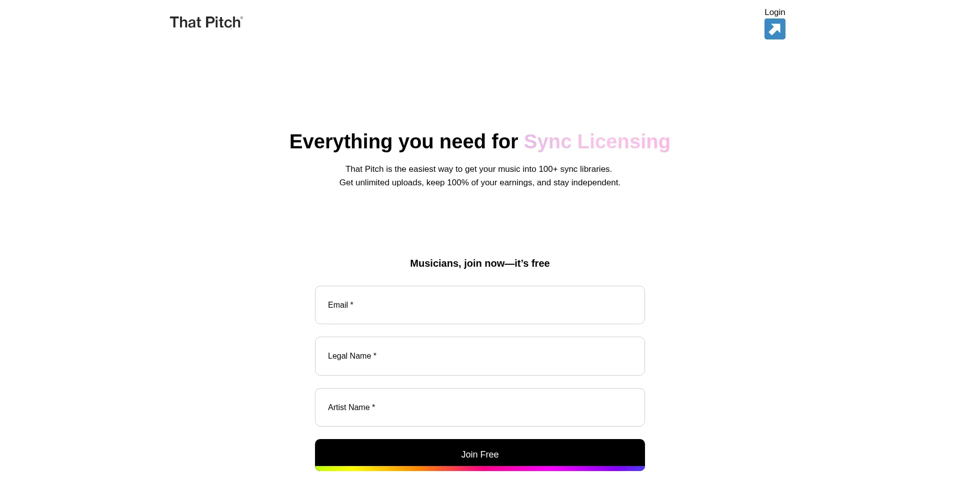 That Pitch is the easiest way to get your music into 100+ sync libraries. Get unlimited uploads, keep 100% of your earnings, and stay independent.