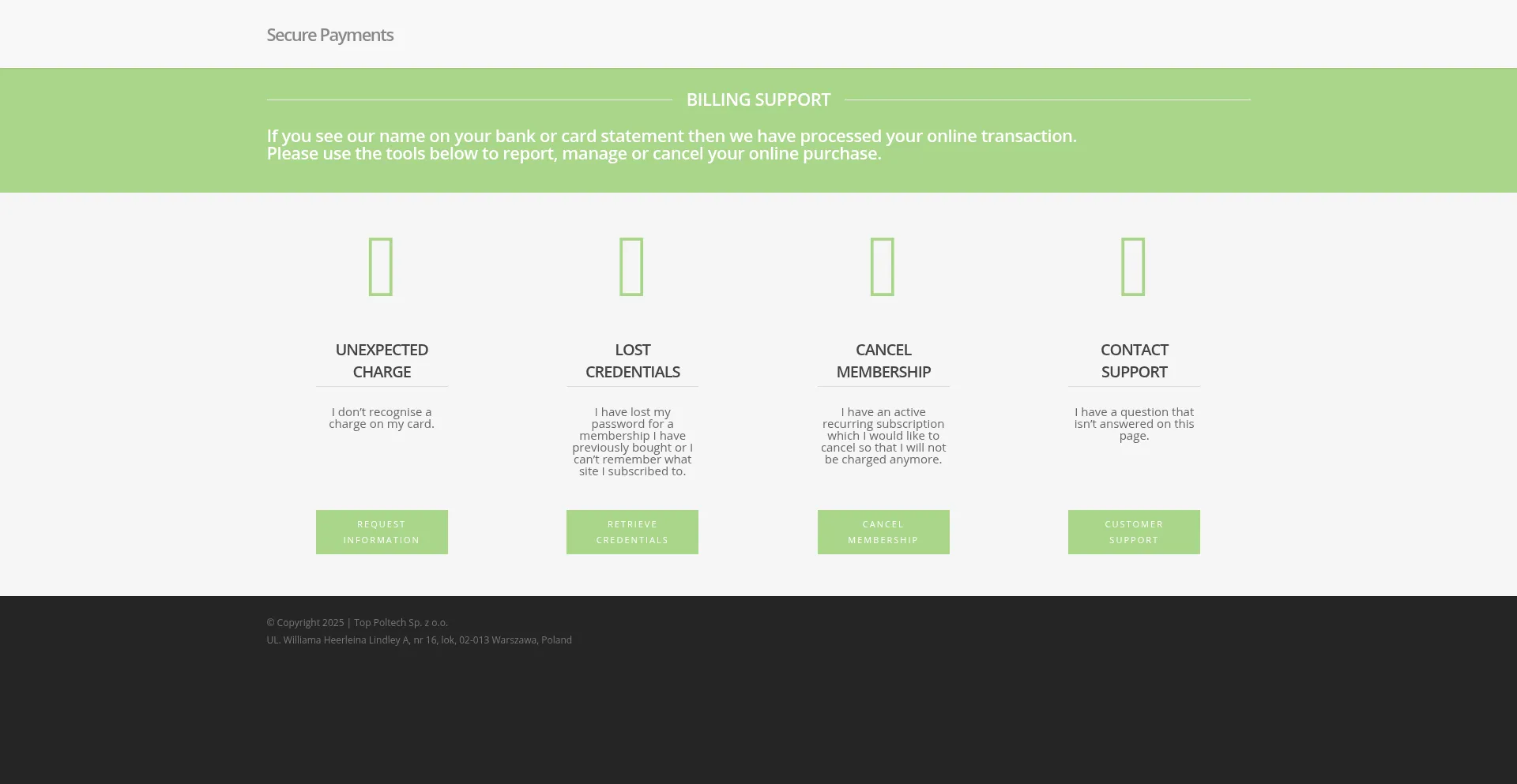 El sitio web contiene secciones dedicadas que abordan disputas de pago, gestión de suscripciones, procedimientos de contracargo, políticas de reembolso y otras preocupaciones de transacciones financieras, indicando operaciones de facturación establecidas.
