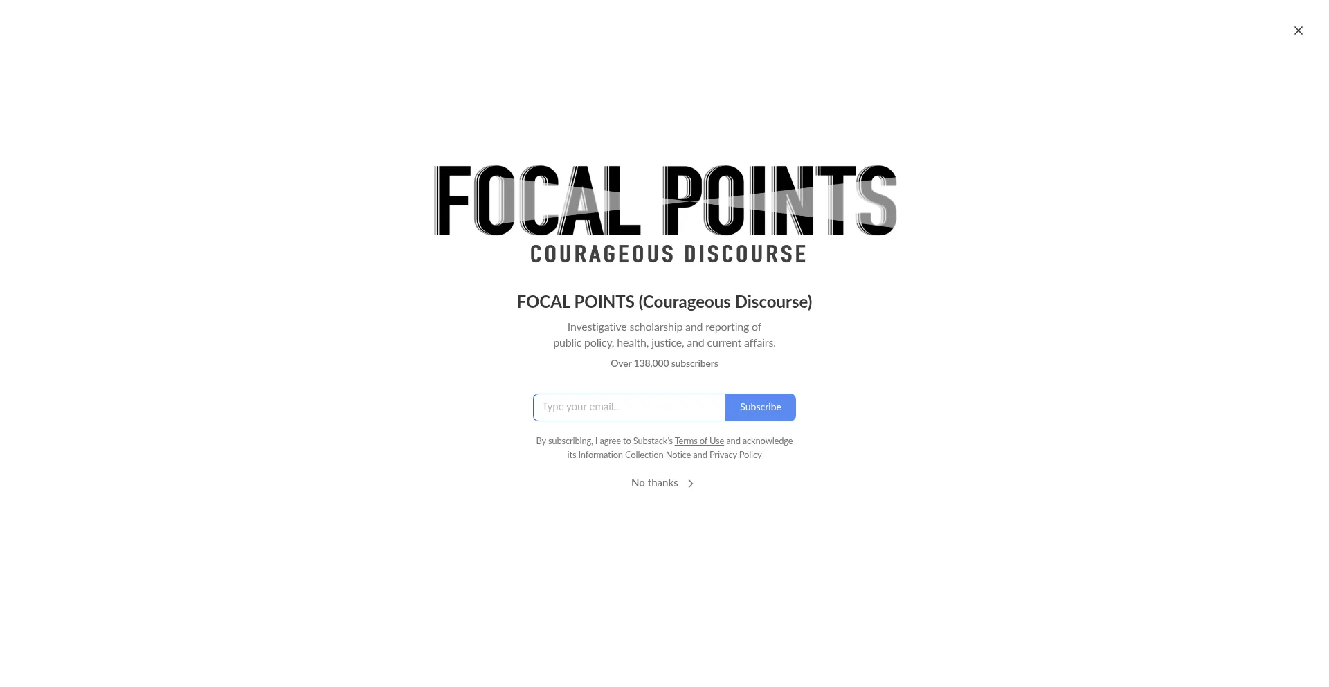 Investigative scholarship and reporting of public policy, health, justice, and current affairs. Click to read FOCAL POINTS (Courageous Discourse), a Substack publication with hu...