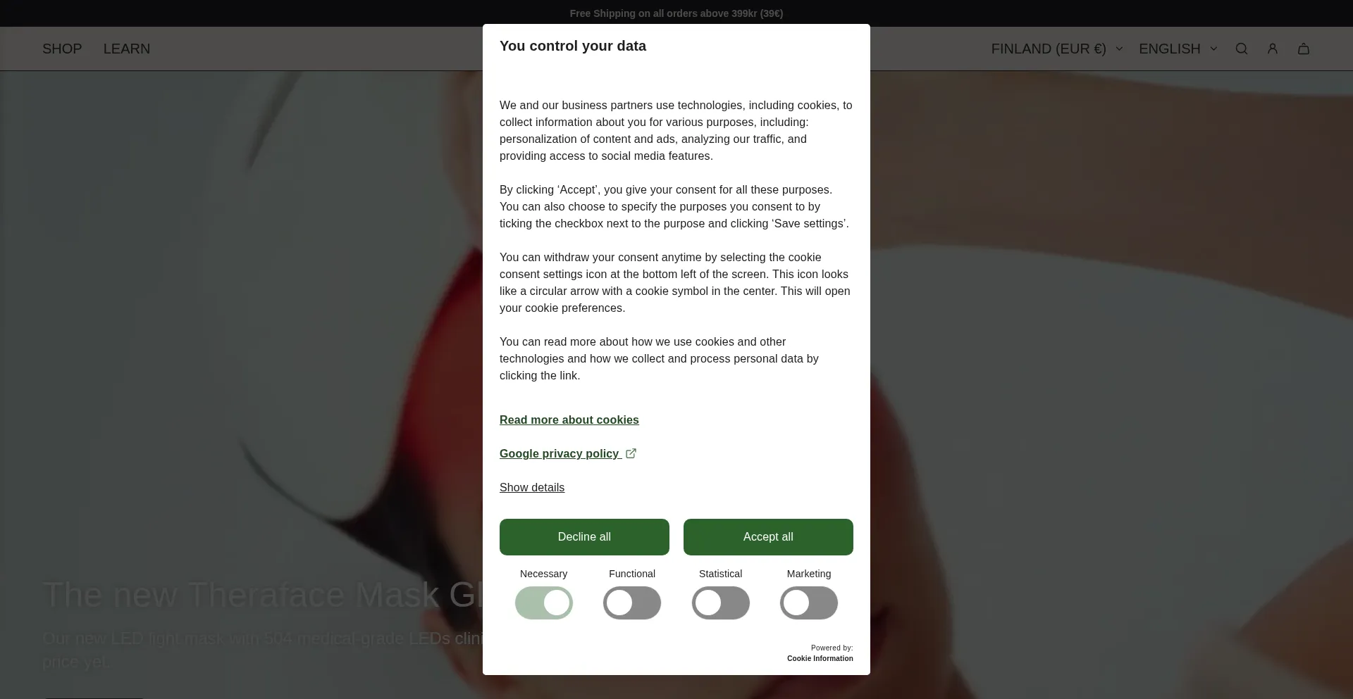 El sitio web implementa mecanismos de consentimiento de cookies en cumplimiento con regulaciones de privacidad como GDPR o CCPA. Esto demuestra que therabody.fi adhiere a estándares de protección de datos y proporciona a los usuarios control sobre prácticas de recolección de datos personales.