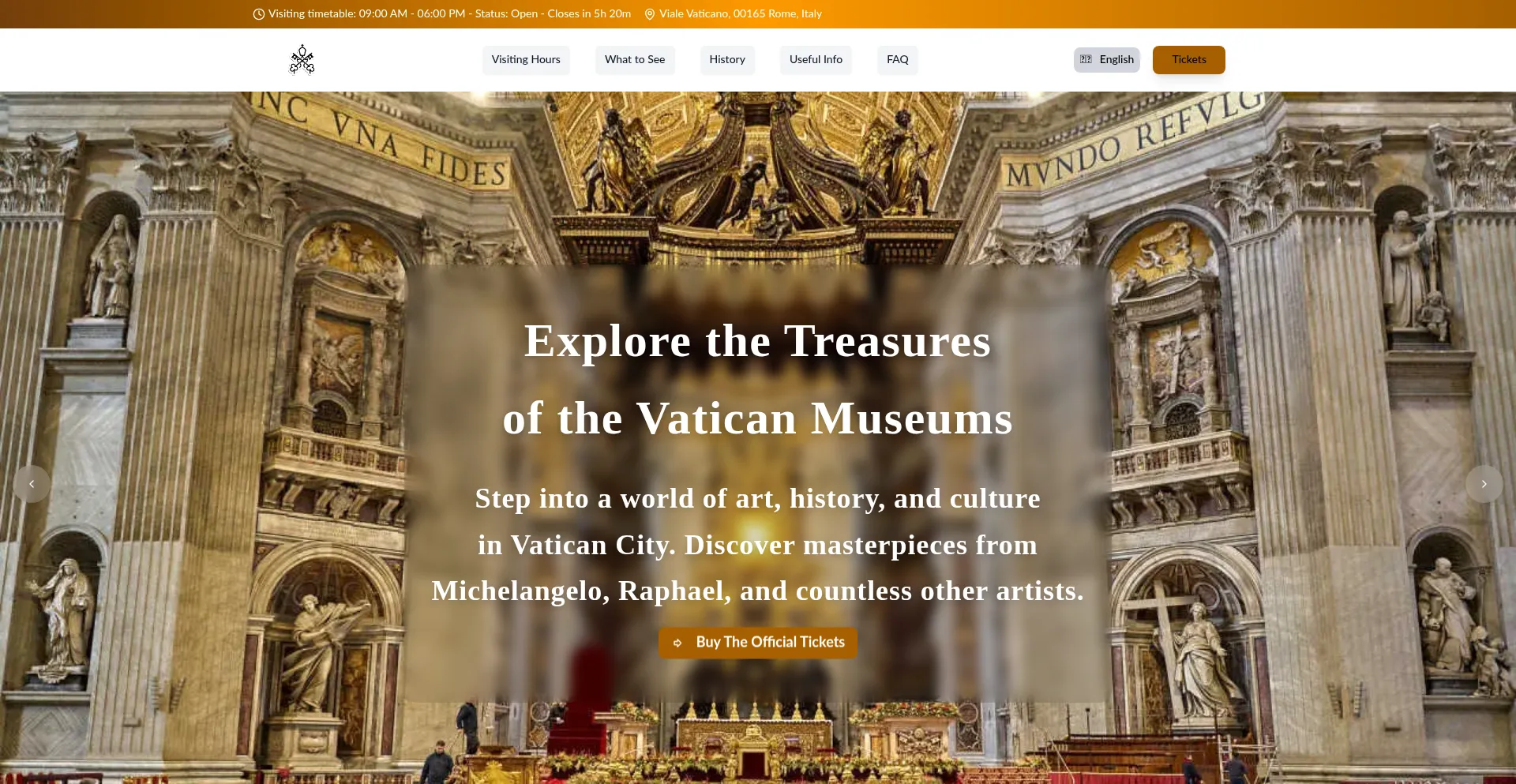Visit the Vatican Museums in Rome and experience the Sistine Chapel, Raphael Rooms, and centuries of art treasures. Book tickets online for your Vatican City visit.
