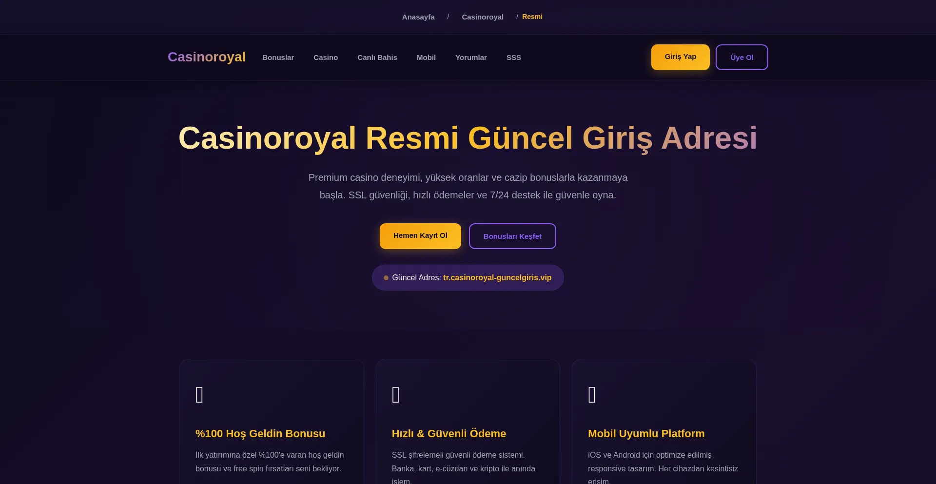 Casinoroyal — mor ve altın tonlarından ilham alan modern tasarım. Canlı bahis, casino, bonuslar ve mobil uyumlu tek sayfa. Güncel giriş adresi ve hızlı destek.