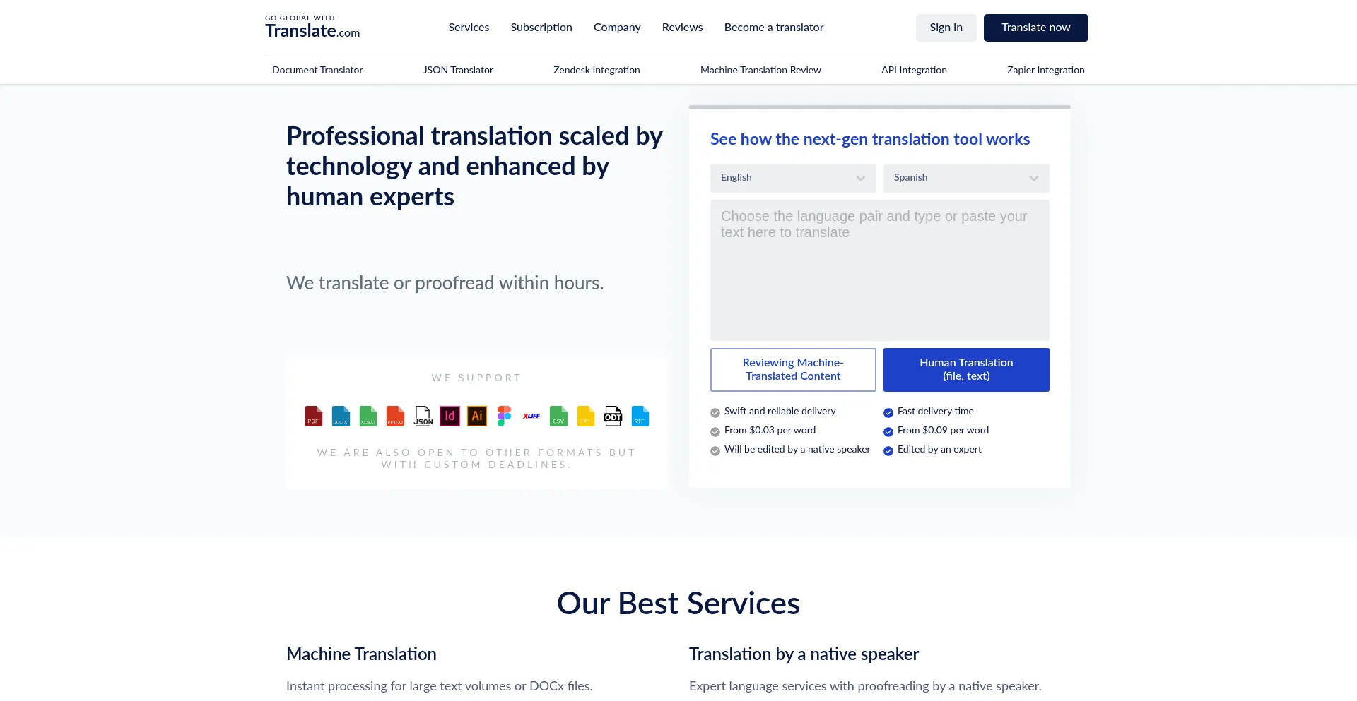 Try our professional translation service online! Instantly translate text and documents into 100+ languages using AI-powered technology or hire human experts. 24/7 online transl...