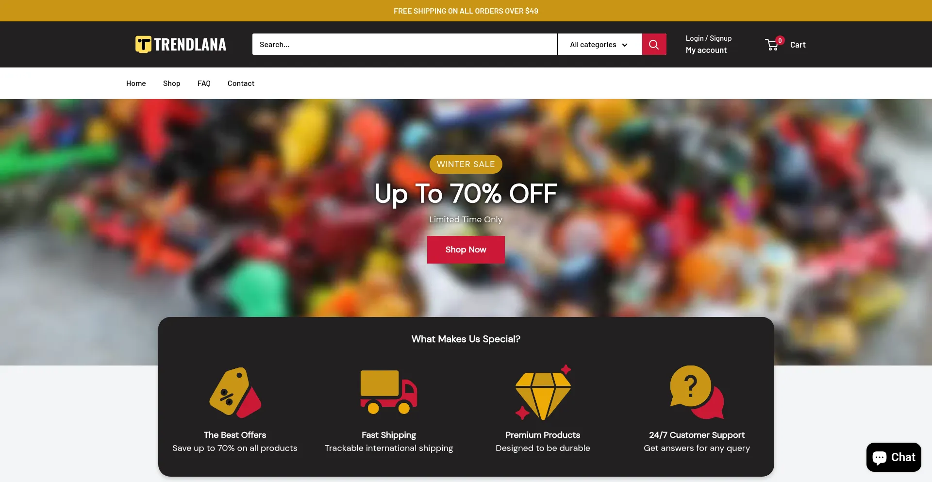 Shopping, Reliable Payment Method, Uses Free eCommerce Engine, Registration Form, Discount, Shopify Platform, Facebook Integration