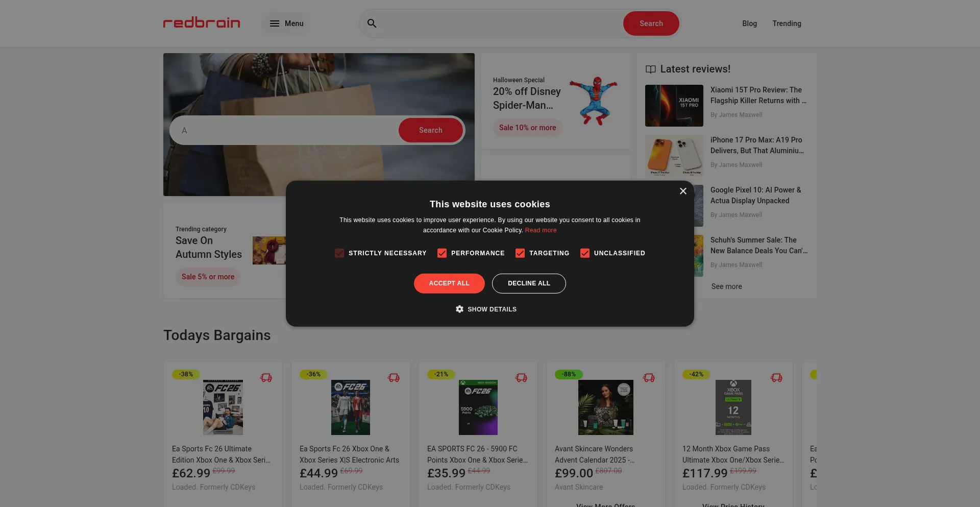 El sitio web implementa mecanismos de consentimiento de cookies en cumplimiento con regulaciones de privacidad como GDPR o CCPA. Esto demuestra que uk.redbrain.shop adhiere a estándares de protección de datos y proporciona a los usuarios control sobre prácticas de recolección de datos personales.