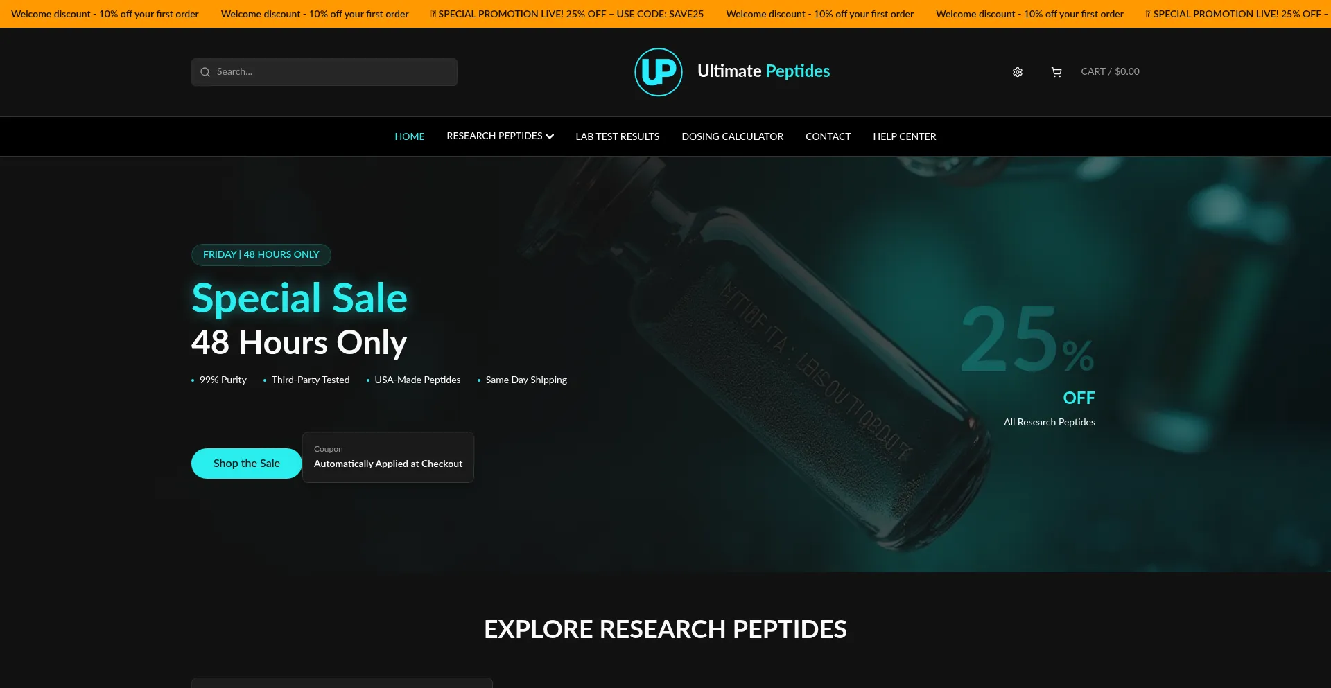 Shop premium research peptides with 99% purity. Third-party tested, USA-made compounds with same-day shipping. Special sale 25% off.