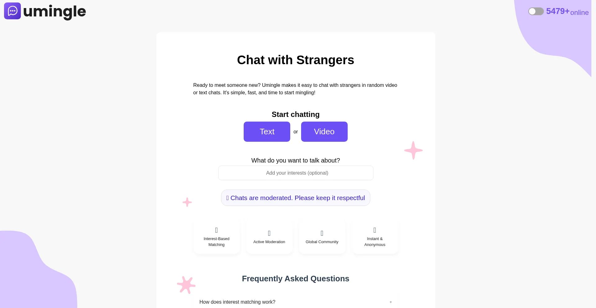 Ready to meet new people? Umingle connects you with strangers for instant text or video chat based on your interests. Start chatting now!