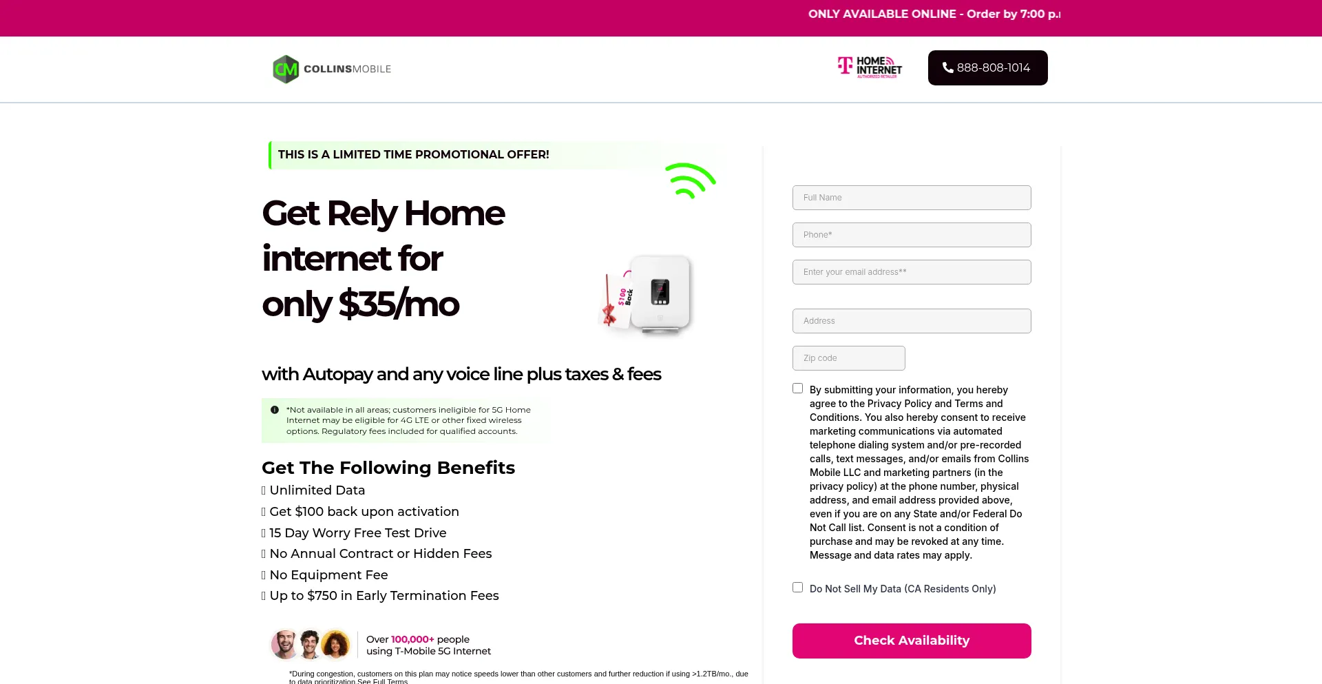 El sitio web implementa formularios de recolección de datos solicitando información personal incluyendo nombres, direcciones de correo electrónico, números de teléfono u otros detalles sensibles. Los usuarios deben verificar la legitimidad de unlimited5ghomeinternet.com y revisar políticas de privacidad antes de enviar datos personales.