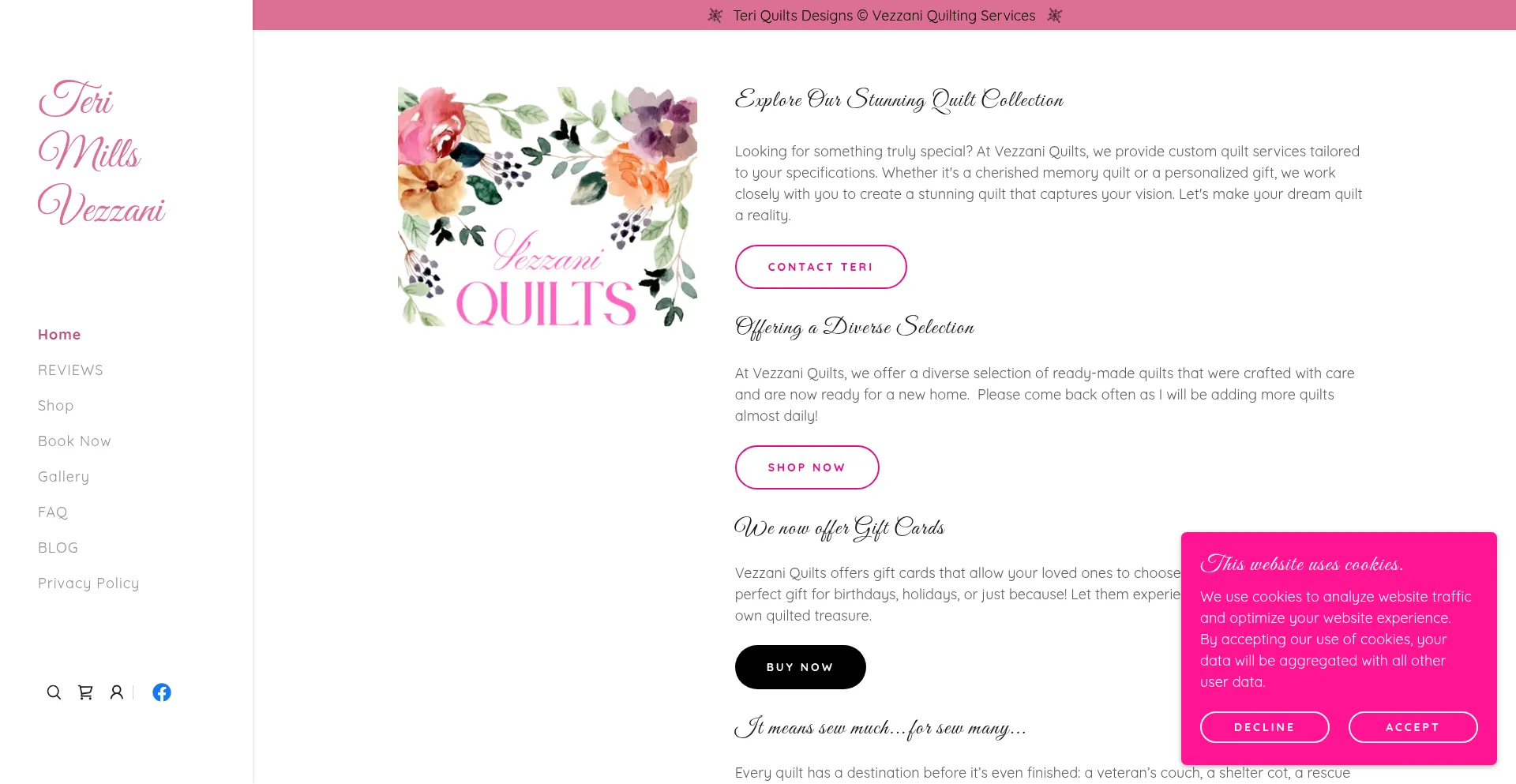 El sitio web implementa mecanismos de consentimiento de cookies en cumplimiento con regulaciones de privacidad como GDPR o CCPA. Esto demuestra que vezzaniquilts.shop adhiere a estándares de protección de datos y proporciona a los usuarios control sobre prácticas de recolección de datos personales.