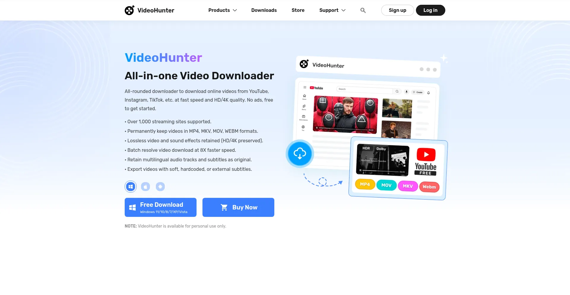 VideoHunter is the best online video downloader that supports fast batch downloads of high-quality videos in 1080p, 4K, and 8K from YouTube and 1,000+ websites.