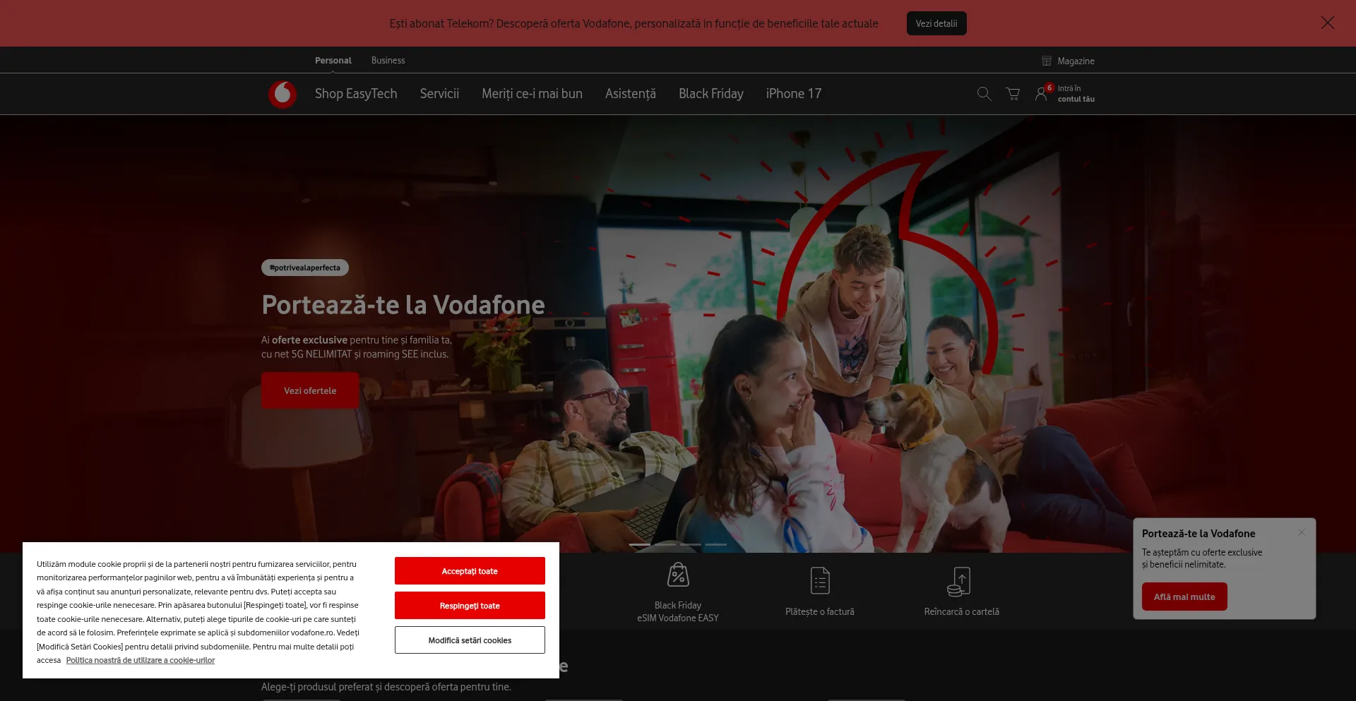 El sitio web implementa mecanismos de consentimiento de cookies en cumplimiento con regulaciones de privacidad como GDPR o CCPA. Esto demuestra que vodafone.ro adhiere a estándares de protección de datos y proporciona a los usuarios control sobre prácticas de recolección de datos personales.