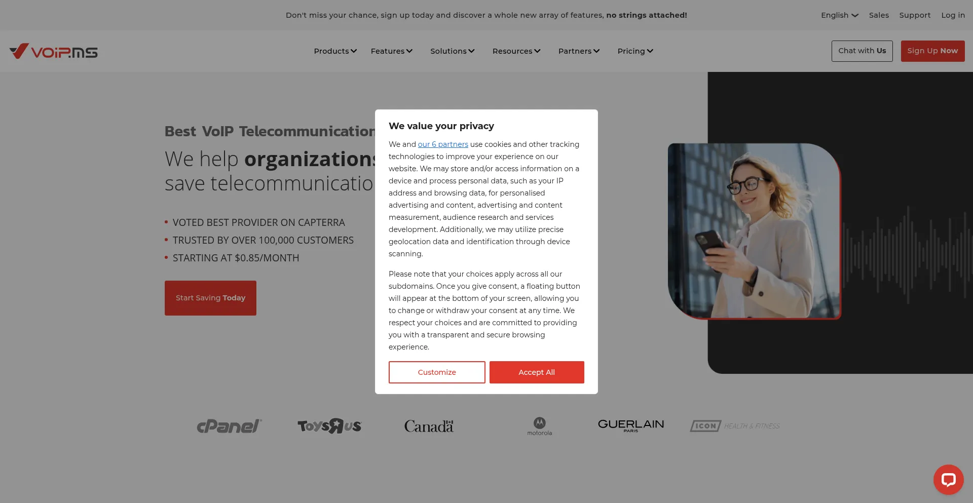 El sitio web implementa mecanismos de consentimiento de cookies en cumplimiento con regulaciones de privacidad como GDPR o CCPA. Esto demuestra que voip.ms adhiere a estándares de protección de datos y proporciona a los usuarios control sobre prácticas de recolección de datos personales.