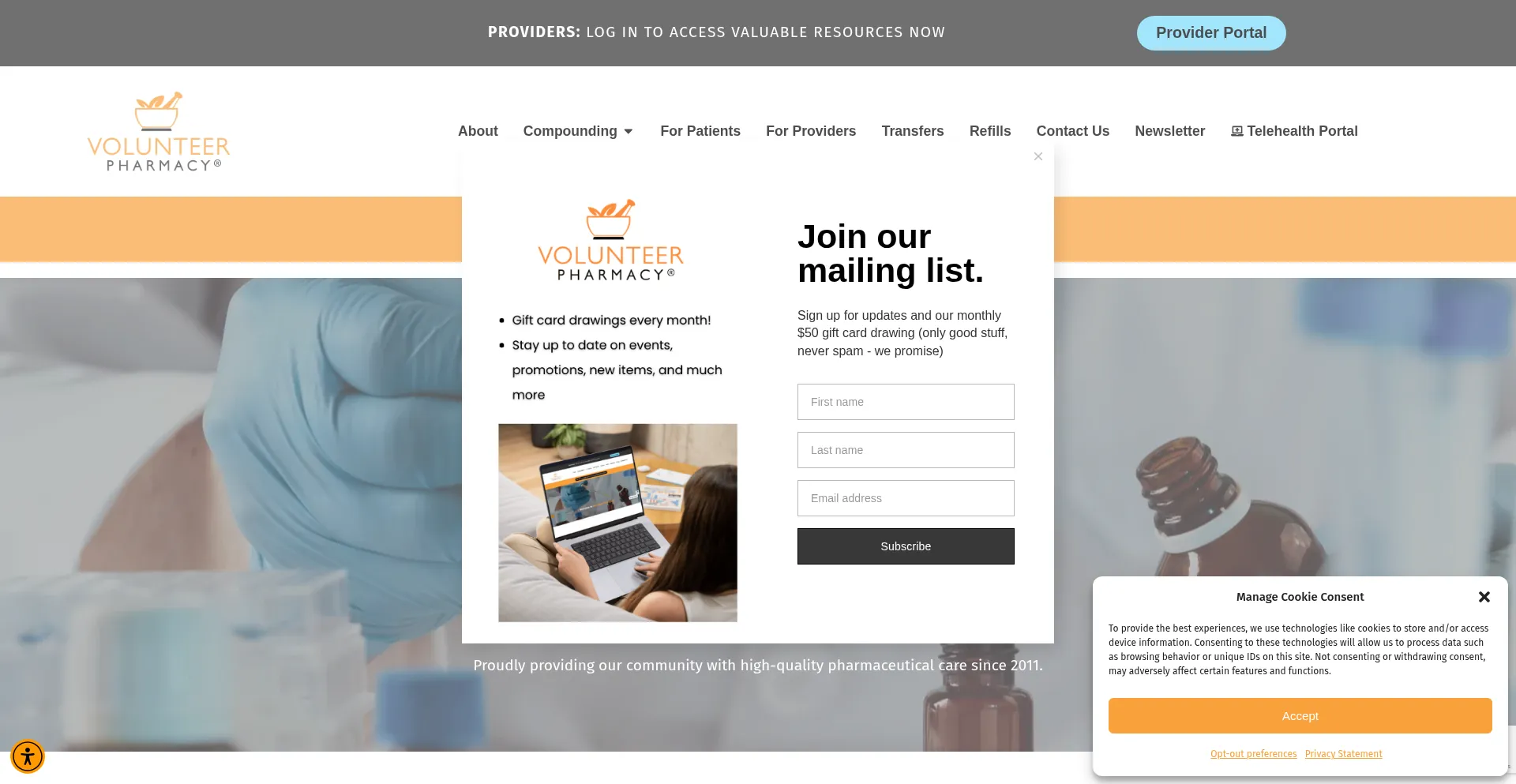 El sitio web implementa mecanismos de consentimiento de cookies en cumplimiento con regulaciones de privacidad como GDPR o CCPA. Esto demuestra que volunteerpharmacy.com adhiere a estándares de protección de datos y proporciona a los usuarios control sobre prácticas de recolección de datos personales.