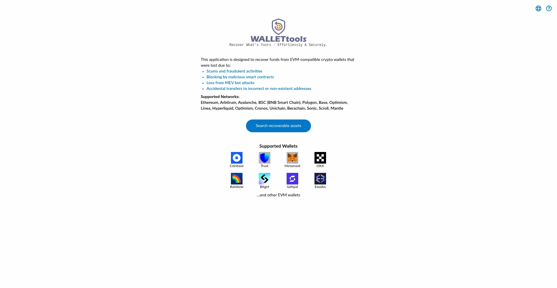 Recover lost or stuck crypto assets with WalletTools. Support for Ethereum, Arbitrum, Optimism, Avalanche, BNB Chain, Polygon, and more.